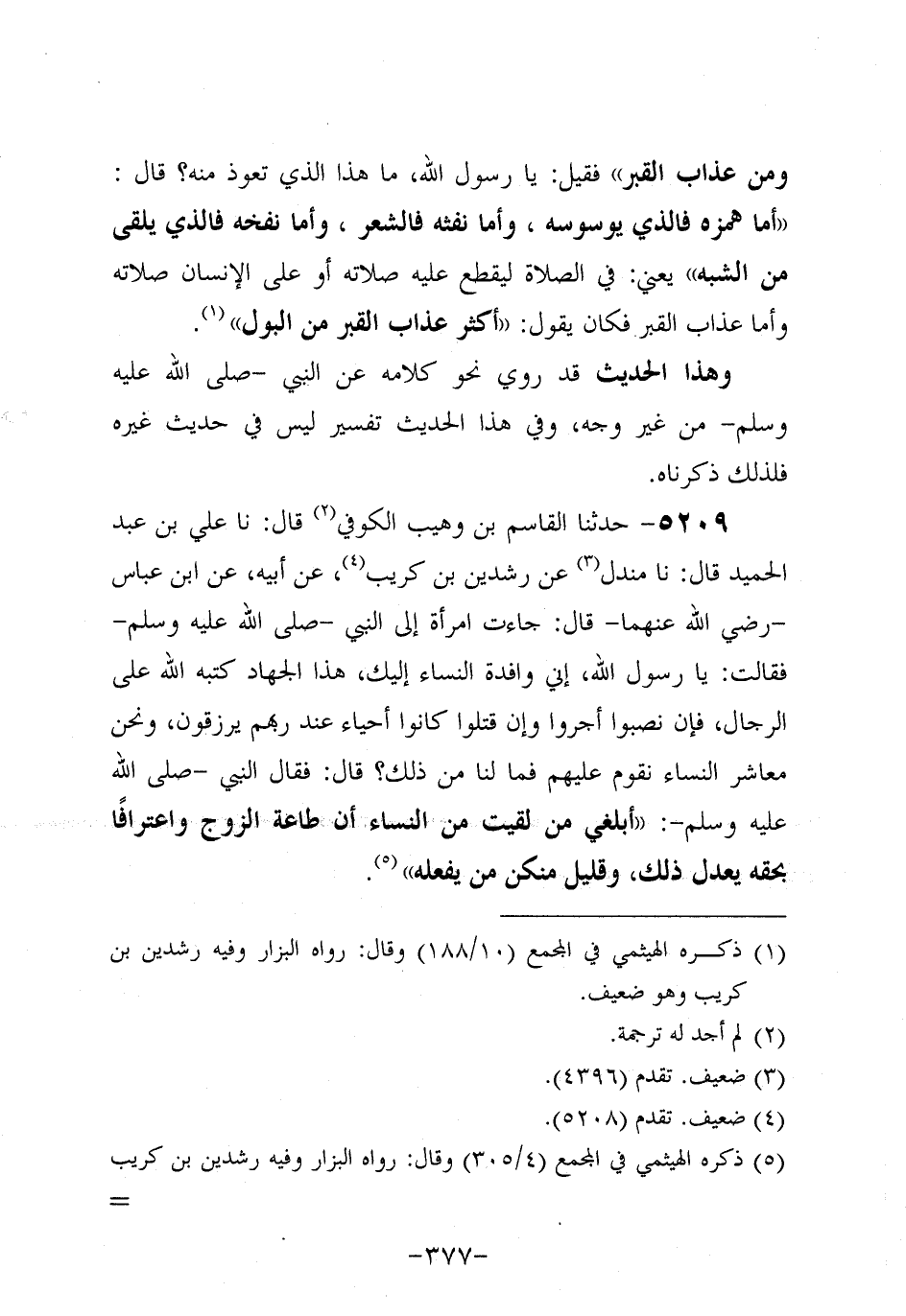 5209- حَدَّثنا القاسم بن وهيب الكوفي، قَال: حَدَّثنا علي بن عَبد الحميد، قَال: حَدَّثنا مَنْدَلٌ عَنْ رِشْدِينَ بْنِ كُرَيب، عَن أَبيهِ، عَنِ ابْنِ عَبَّاسٍ، رَضِي اللَّهُ عَنْهُمَا، قَالَ: جَاءَتِ امْرَأَةٌ إِلَى النَّبِيّ صَلَّى اللَّهُ عَلَيه وَسَلَّم فَقَالَتْ: يَا رَسولَ اللهِ إِنِّي وَافِدَةُ النِّسَاءِ إِلَيْكَ هَذَا الْجِهَادُ كَتَبَهُ اللَّهُ عَلَى الرِّجَالِ فَإِنْ نَصِبُوا أُجِرُوا، وَإن قُتِلُوا كَانُوا أَحْيَاءً عِنْدَ رَبِّهِمْ يُرْزَقُونَ وَنَحْنُ مَعَاشِرَ النِّسَاءِ نَقُومُ عَلَيْهِمْ فَمَا لَنَا مِنْ ذَلِكَ؟ قَالَ: فَقَالَ النَّبِيّ صَلَّى اللَّهُ عَلَيه وَسَلَّم: أَبْلِغِي مَنْ لَقِيتِ مِنَ النِّسَاءِ أَنَّ طَاعَةَ الزَّوْجِ وَاعْتِرَافًا بِحَقِّهِ يَعْدِلُ ذَلِكَ وَقَلِيلٌ مِنْكُنَّ مَنْ يَفْعَلُهُ.