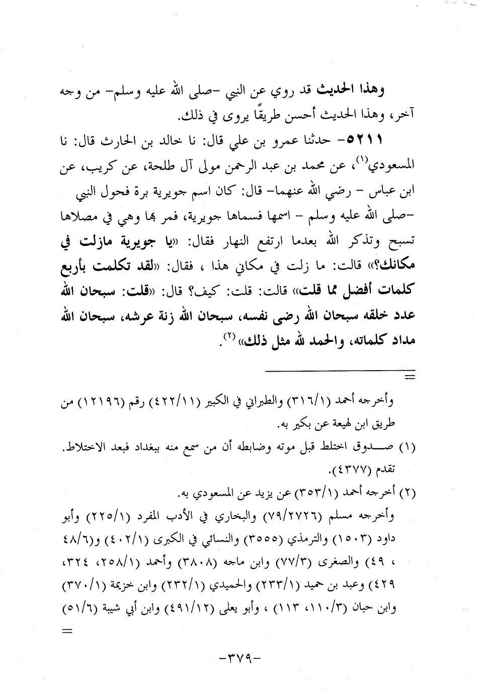5211- حَدَّثنا عَمْرو بن علي، قَال: حَدَّثنا خالد بن الحارث قال: حَدَّثنا الْمَسْعُودِيُّ عَنْ مُحَمد بْنِ عَبد الرَّحْمَنِ مَوْلَى آلِ طَلْحَةَ عَنْ كُرَيب، عَنِ ابْنِ عَبَّاسٍ، رَضِي اللَّهُ عَنْهُمَا، قَالَ: كَانَ اسْمُ جُوَيْرِيَةَ بُرَّةُ فَحَوَّلَ النَّبِيّ صَلَّى اللَّهُ عَلَيه وَسَلَّم اسْمَهَا فَسَمَّاهَا جُوَيْرِيَةَ فَمَرَّ بِهَا وَهِيَ فِي مُصَلاهَا تُسَبِّحُ وَتَذْكُرُ اللَّهَ بَعْدَ مَا ارْتَفَعَ النهار فقال: ياجويرية مازلت في مكانك؟ قالت: مازلت فِي مَكَانِي هَذَا فَقَالَ: لَقَدْ تَكَلَّمْتِ بِأَرْبَعِ كَلِمَاتٍ أَفْضَلَ مِمَّا قُلْتِ قَالَتْ: قُلْتُ: كَيْفَ؟ قَالَ: قُلْتِ سُبْحَانَ اللَّهِ عَدَدَ خَلْقِهِ سُبْحَانَ اللَّهِ رِضَى نَفْسِهِ سُبْحَانَ اللَّهِ زِنَةَ عَرْشِهِ سُبْحَانَ اللَّهِ مِدَادَ كَلِمَاتِهِ وَالْحَمْدُ لِلَّهِ مِثْلُ ذَلِكَ.
