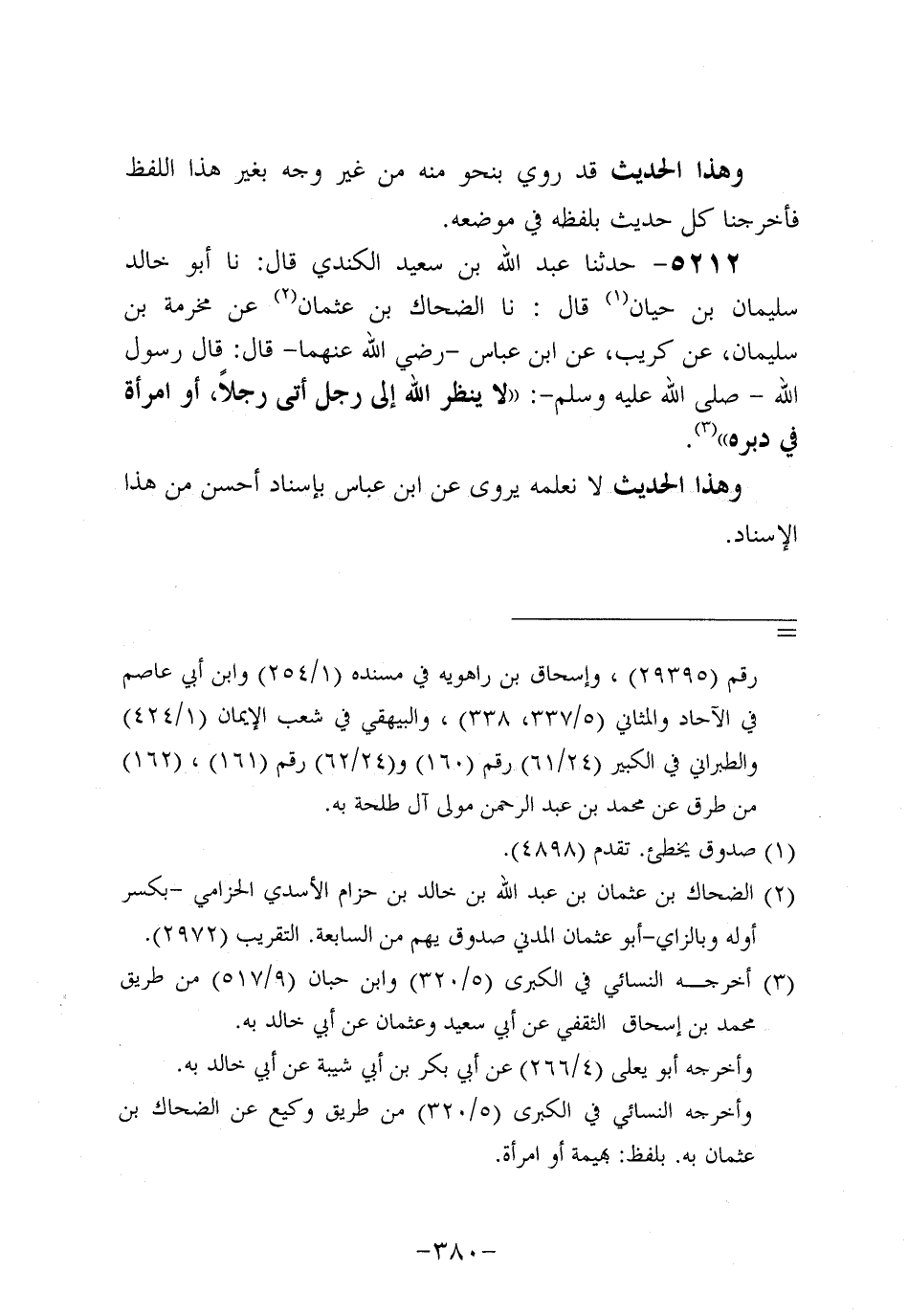 5212- حَدَّثنا عَبْدُ اللهِ بْنُ سَعِيدٍ الكِندِيُّ، قَالَ: حَدَّثَنَا أَبُو خَالِدٍ سليمان بن حيان، قَال: حَدَّثنا الضَّحَّاكُ بْنُ عُثْمَانَ، عَنْ مَخْرَمَةَ بْنِ سُلَيْمَانَ، عَنْ كُرَيْبٍ، عَنِ ابْنِ عَبَّاسٍ، رَضِي اللَّهُ عَنْهُمَا، قَالَ: قَالَ رَسُولُ اللهِ صَلَّى اللَّهُ عَلَيْهِ وَسَلَّمَ: لاَ يَنْظُرُ اللَّهُ إِلَى رَجُلٍ، أَتَى رَجُلاً، أَوِ امْرَأَةً، فِي دُبُره.
