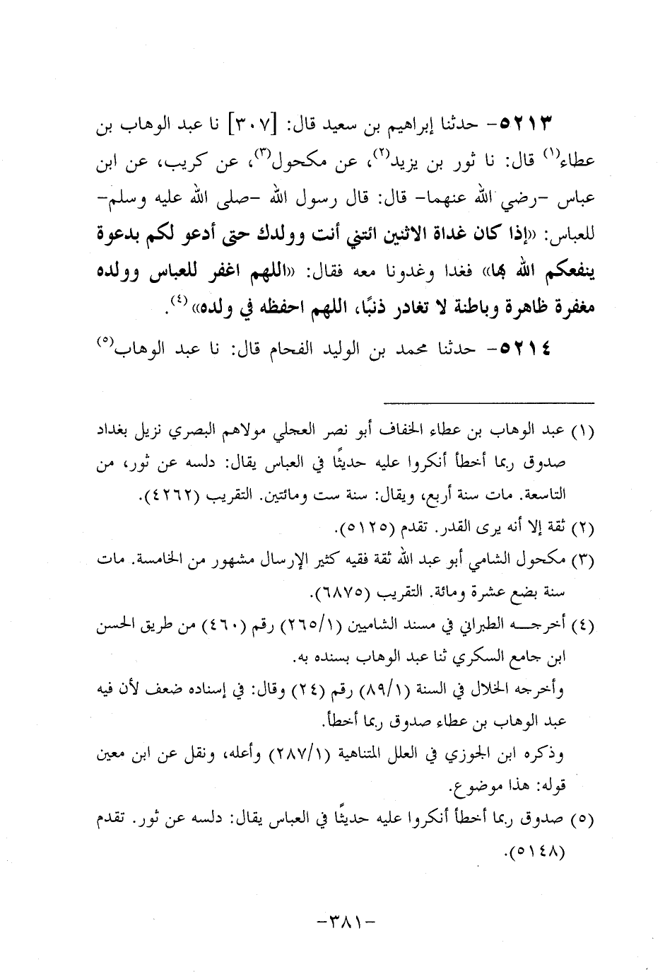 5213- حَدَّثنا إبراهيم بن سَعِيد، قَال: حَدَّثنا عَبد الوَهَّاب بن عطاء، قَال: حَدَّثنا ثَوْرُ بْنُ يَزِيدَ عَنْ مَكْحُولٍ عَنْ كُرَيب، عَنِ ابْنِ عَبَّاسٍ رَضِيَ اللَّهُ عَنْهُمَا قَالَ: قَالَ رَسُول اللهِ صَلَّى اللَّهُ عَلَيه وَسَلَّم لِلْعَبَّاسِ: إِذَا كَانَ غَدَاةَ الاثْنَيْنِ ائْتِنِي أَنْتَ وَوَلَدُكَ حَتَّى أَدْعُوَ لَكُمْ بِدَعْوَةٍ يَنْفَعُكُمُ اللَّهُ بِهَا فَغَدَا وَغَدَوْنَا مَعَهُ فَقَالَ: اللَّهُمَّ اغْفِرْ لِلْعَبَّاسِ وَوَلَدِهِ مَغْفِرَةً ظَاهِرَةً وَبَاطِنَةً لا تُغَادِرُ ذَنْبًا اللَّهُمَّ احْفَظْهُ فِي وَلَدِهِ.