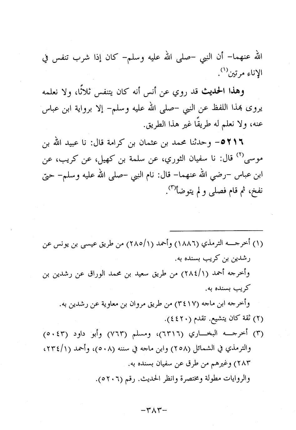 5216- وحَدَّثنا مُحَمد بْنُ عُثمَان بْنِ كَرَامَةَ، قَال: حَدَّثنا عُبَيد الله بن موسى، قَال: حَدَّثنا سُفيان الثَّورِيّ، عَن سَلَمة بْنِ كُهَيل عَنْ كُرَيب، عَنِ ابْنِ عَبَّاسٍ، رَضِي اللَّهُ عَنْهُمَا، قَالَ: نَامَ النَّبِيّ صَلَّى اللَّهُ عَلَيه وَسَلَّم حَتَّى نَفَخَ، ثُمَّ قَامَ فَصَلَّى وَلَمْ يَتَوَضَّأْ.