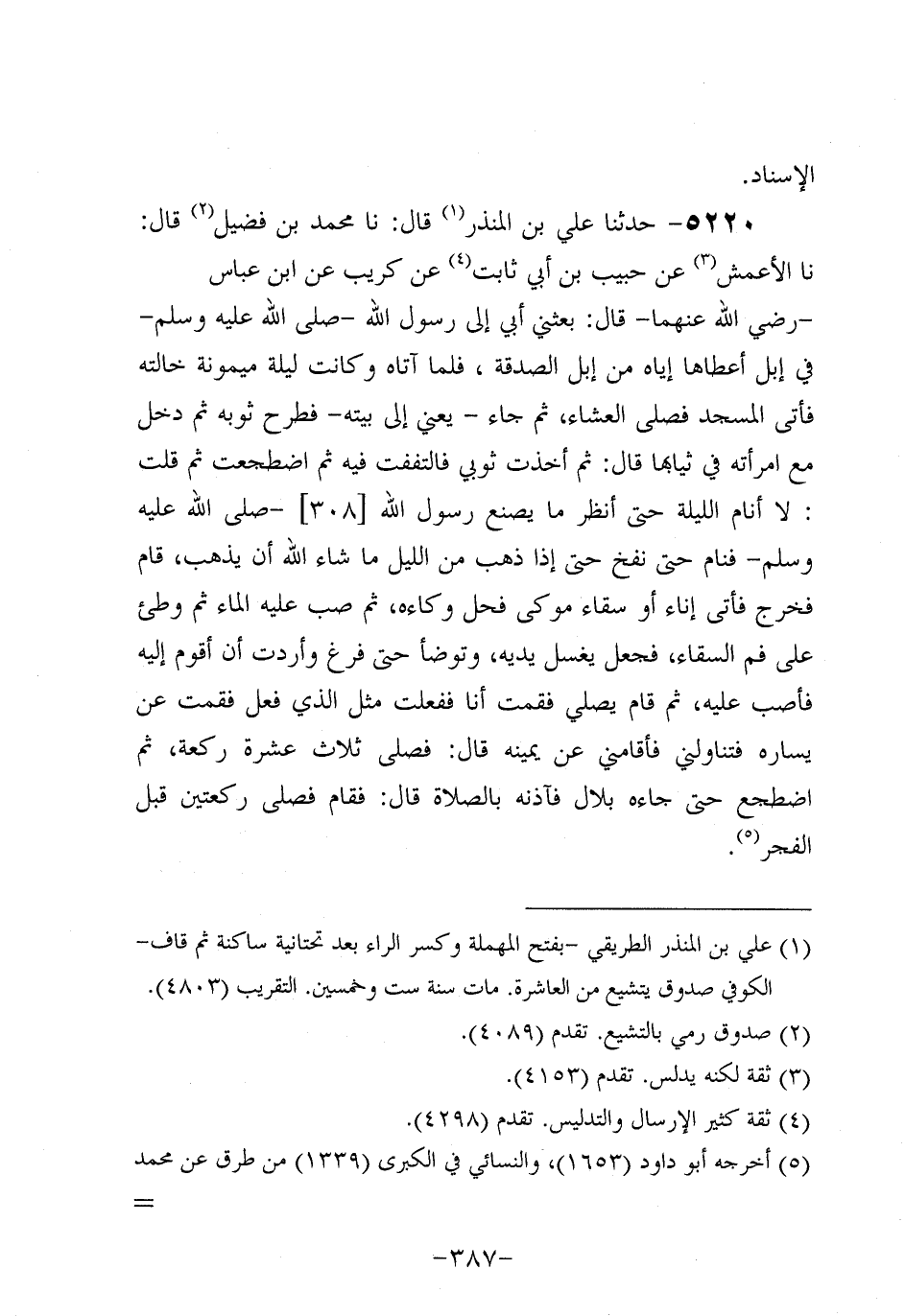 5220- حَدَّثنا علي بن المنذر، قَال: حَدَّثنا مُحَمد بن فضيل، قَال: حَدَّثنا الأَعمَش، عَن حَبِيبِ بْنِ أَبِي ثَابِتٍ عَنْ كُرَيب، عَنِ ابْنِ عَبَّاسٍ، رَضِي اللَّهُ عَنْهُمَا، قَالَ: بَعَثَنِي أَبِي إِلَى رَسُولِ اللَّهِ صَلَّى اللَّهُ عَلَيه وَسَلَّم فِي إِبِلٍ أَعْطَاهَا إِيَّاهُ مِنْ إِبِلِ الصَّدَقَةِ فَلَمَّا أَتَاهُ وَكَانَتْ لَيْلَةُ مَيْمُونَةَ خَالَتُهُ فَأَتَى الْمَسْجِدَ فَصَلَّى الْعِشَاءَ، ثُمَّ جَاءَ، يَعْنِي إِلَى بَيْتِهِ فَطَرَح ثَوْبَهُ، ثُمَّ دَخَلَ مَعَ امْرَأَتِهِ فِي ثِيَابِهَا قَالَ: ثُمَّ أَخَذْتُ ثَوْبِي فَالْتَفَفْتُ فِيهِ، ثُمَّ اضْطَجَعْتُ، ثُمَّ قُلْتُ: لا أَنَامُ اللَّيْلَةَ حَتَّى أَنْظُرَ مَا يَصْنَعُ رَسُولُ اللَّهِ صَلَّى اللَّهُ عَلَيه وَسَلَّم فَنَامَ حَتَّى نَفَخَ حَتَّى إِذَا ذَهَبَ مِنَ اللَّيْلِ مَا شَاءَ اللَّهُ أَنْ يَذْهَبَ قَامَ فَخَرَجَ فَأَتَى إِنَاءً، أَوْ سِقَاءً مُوكًى فَحَلَّ وكاءه، ثُمَّ صب عليه الماء، ثُمَّ وطيء عَلَى فَمِ السِّقَاءِ فَجَعَل يَغْسِلُ يَدَيْهِ وَتَوَضَّأَ حَتَّى فَرَغَ وَأَرَدْتُ أَنْ أَقُومَ إِلَيْهِ فَأَصُبُّ عَلَيْهِ، ثُمَّ قَامَ يُصَلِّي فَقُمْتُ أَنَا فَفَعَلْتُ مِثْلَ الَّذِي فَعَلَ فَقُمْتُ عَنْ يَسَارِهِ فَتَنَاوَلَنِي فَأَقَامَنِي عَنْ يَمِينِهِ قَالَ: فَصَلَّى ثَلاثَ عَشْرَةَ رَكْعَةً، ثُمَّ اضْطَجَعَ حَتَّى جَاءَهُ بِلالٌ فَآذَنَهُ بِالصَّلاةِ قَالَ: فَقَامَ فَصَلَّى رَكْعَتَيْنِ قَبْلَ الْفَجْرِ.