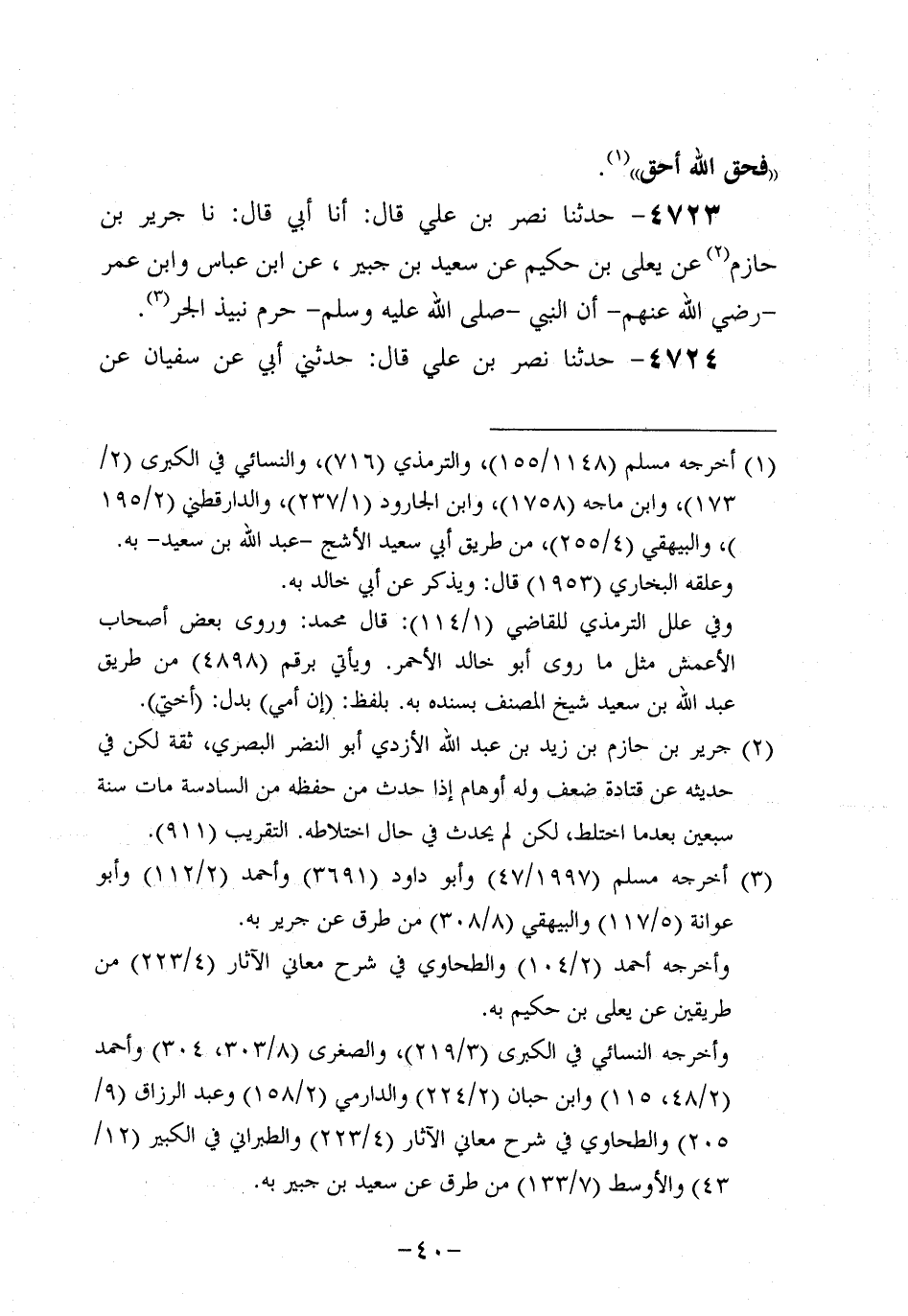 4723- حَدَّثنا نصر بن علي، قال: أَخْبَرَنَا أبي، قَال: حَدَّثنا جَرِيرُ بْنُ حَازِمٍ عَنْ يَعْلَى بْنِ حَكِيمٍ، عَن سَعِيد بْنِ جُبَير، عَنِ ابْنِ عَبَّاسٍ، وَابن عُمَر رَضِيَ اللَّهُ عَنْهُمْ أَنَّ النَّبيَّ صَلَّى اللَّهُ عَلَيه وَسَلَّم حَرَّمَ نَبِيذَ الْجَرِّ.