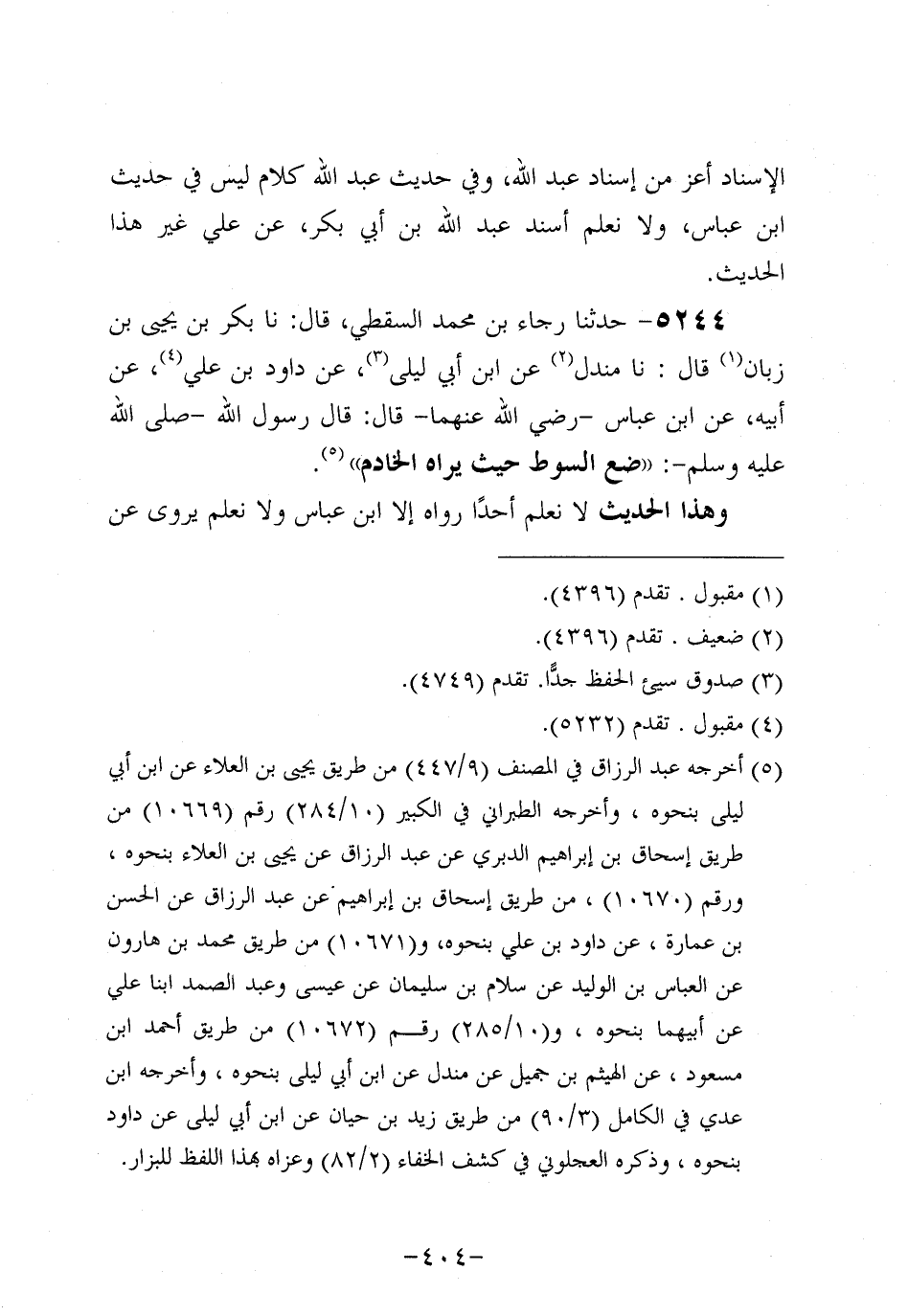 5244- حَدَّثنا رجاء بن مُحَمد السقطي، قَال: حَدَّثنا بَكْرُ بْنُ يَحْيَى بْنِ زَبَّانَ، قَال: حَدَّثنا مَنْدَلٌ، عَن ابْنِ أَبِي لَيْلَى، عَن دَاوُدَ بْنِ عَلِيٍّ، عَن أَبيهِ، عَنِ ابْنِ عَبَّاسٍ رَضِيَ اللَّهُ عَنْهُمَا قَالَ: قَالَ رَسُولُ اللَّهِ صَلَّى اللَّهُ عَلَيْهِ وَسَلَّمَ ضَعِ السَّوْطَ حَيْثُ يَرَاهُ الْخَادِمُ.