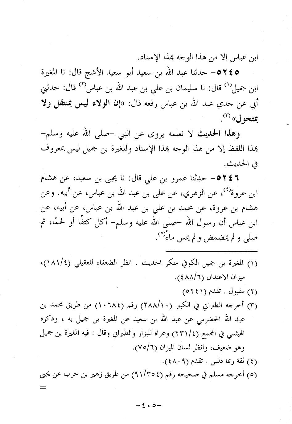 5245- حَدَّثنا عَبد اللَّهِ بْنُ سَعِيد أَبُو سَعِيد الأشج، قَال: حَدَّثنا المغيرة بن جميل، قَال: حَدَّثنا سُلَيْمَانَ بْنِ عَلِيِّ بْنِ عَبد اللَّهِ بْنِ عَبَّاسٍ قَالَ: حَدَّثَنِي أَبِي عَنْ جَدِّي عَبد اللَّهِ بْنِ عَبَّاسٍ رَفَعَهُ قَالَ: إِنَّ الْوَلاءَ ليس بمنتقل، ولاَ بمتحول.