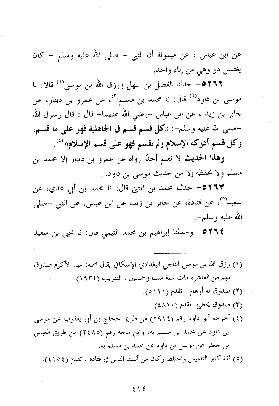 5262- حَدَّثنا الْفَضْلُ بْنُ سَهْل، ورِزق اللَّهِ بْنُ موسى، قَالاَ: حَدَّثنَا موسى بن داود، قَال: حَدَّثنا مُحَمد بْنُ مُسْلِمٍ، عَنْ عَمْرو بْنِ دِينار، عَنْ جَابِرِ بْنِ زَيْدٍ، عَنِ ابْنِ عَبَّاسٍ، رَضِي اللَّهُ عَنْهُمَا، قَالَ: قَالَ رَسُول اللهِ صَلَّى اللَّهُ عَلَيه وَسَلَّم: كُلُّ قِسْمٍ قُسِمَ فِي الْجَاهِلِيَّةِ فَهُوَ عَلَى مَا قُسِمَ، وَكُلُّ قِسْمٍ أَدْرَكَهُ الإِسْلامُ وَلَمْ يُقْسَمْ فَهُوَ عَلَى قِسْمِ الإِسْلامِ.