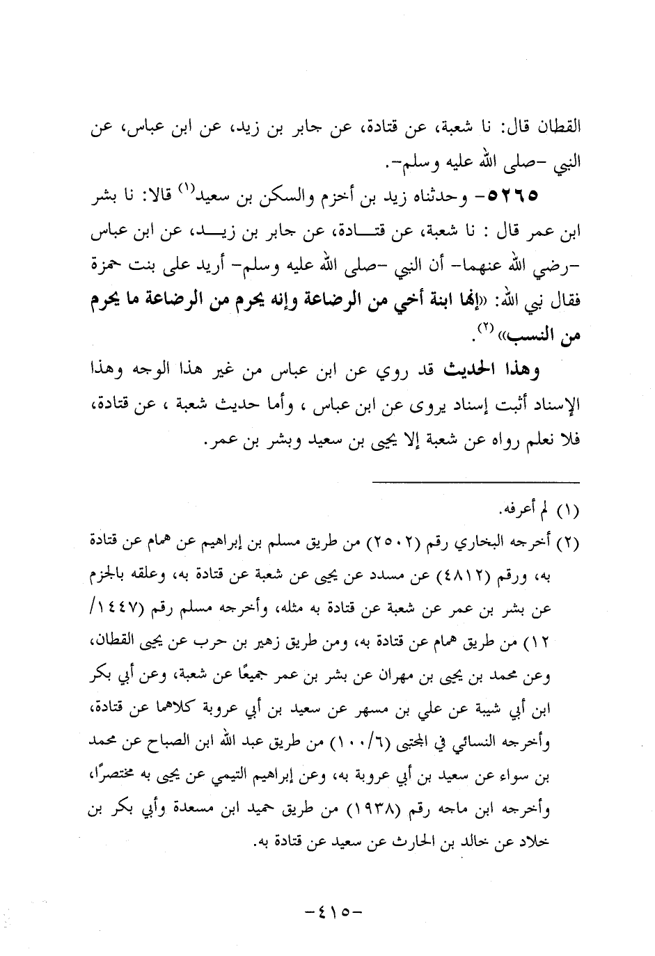 5265- وحَدَّثناه زَيْدُ بْنُ أَخْزَمَ وَالسَّكَنُ بْنُ سَعِيد، قَالاَ: حَدَّثنَا بِشْر بن عُمَر، قَال: حَدَّثنا شُعْبَةُ، عَن قَتَادَةَ، عَنْ جَابِرِ بْنِ زَيْدٍ، عَنِ ابْنِ عَبَّاسٍ، رَضِي اللَّهُ عَنْهُمَا، أَنَّ النَّبيَّ صَلَّى اللَّهُ عَلَيه وَسَلَّم أُرِيَد عَلَى بنت حمزة فَقَالَ نَبِيُّ اللَّهِ صَلَّى اللَّهُ عَلَيه وَسَلَّم: إِنَّهَا ابْنَةُ أَخِي مِنَ الرَّضَاعَةِ وَإِنَّهُ يَحْرُمُ مِنَ الرَّضَاعَةِ مَا يَحْرُمُ مِنَ النَّسَبِ.