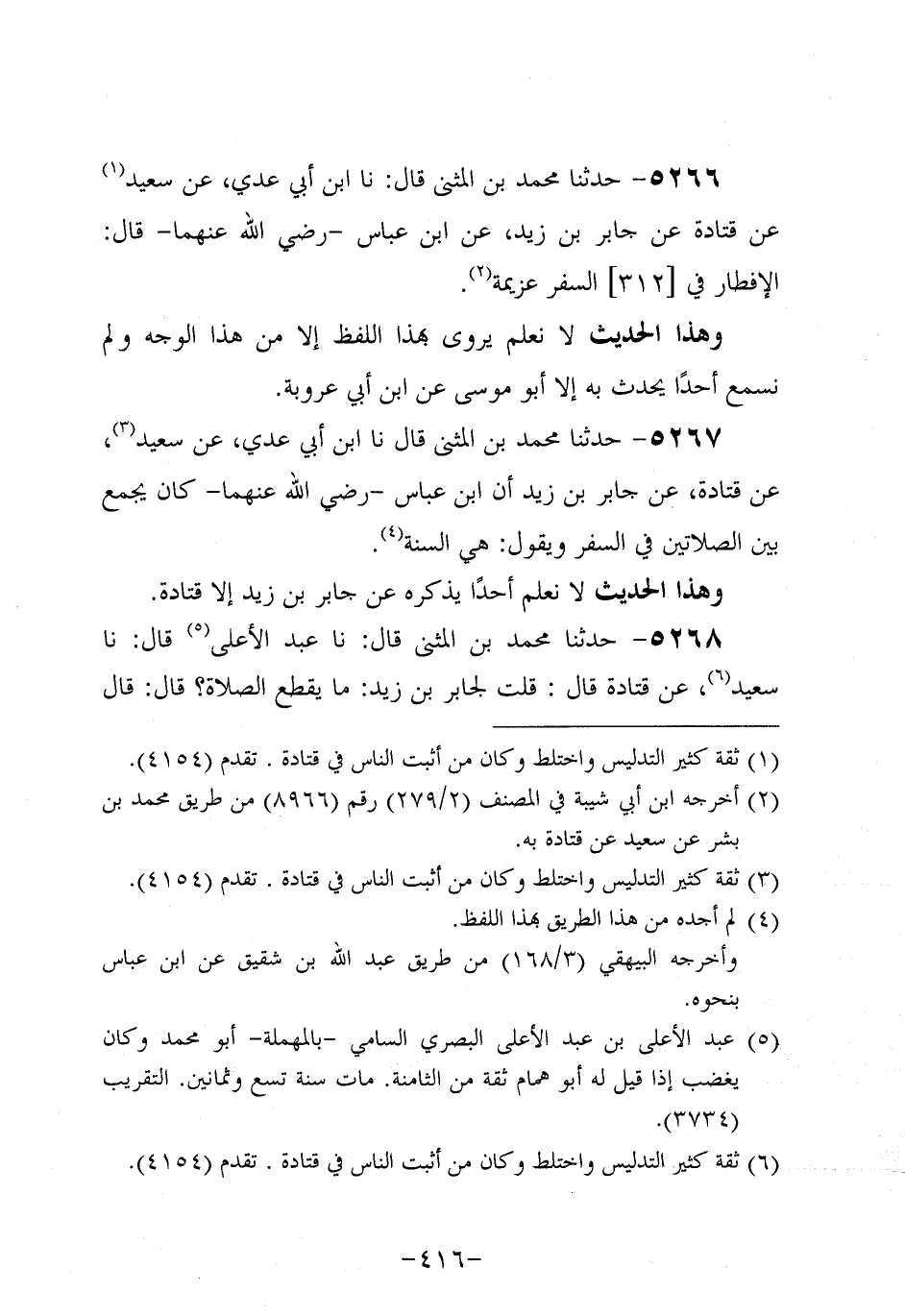 5267- حَدَّثنا مُحَمَّدُ بْنَ الْمُثَنَّى، قَال: حَدَّثنا ابْنُ أَبِي عَدِيّ، عَن سَعِيد، عَن قَتَادَةَ، عَنْ جَابِرِ بْنِ زَيْدٍ أَنَّ ابْنَ عَبَّاسٍ، رَضِي اللَّهُ عَنْهُمَا، كَانَ يَجْمَعُ بَيْنَ الصَّلاتَيْنِ فِي السَّفَرِ وَيَقُولُ: هِيَ السُّنَّةُ.