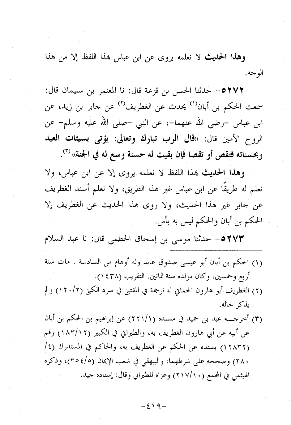 5272- حَدَّثنا الحسن بن قزعة، قَال: حَدَّثنا الْمُعْتَمِرُ بْنُ سُلَيْمَانَ، قَالَ: سَمِعْتُ الْحَكَمَ بْنَ أَبَان يُحَدِّثُ عَنِ الْغِطْرِيفِ عَنْ جَابِرِ بْنِ زَيْدٍ، عَنِ ابْنِ عَبَّاسٍ، رَضِي اللَّهُ عَنْهُمَا، عَنِ النَّبِيّ صَلَّى اللَّهُ عَلَيه وَسَلَّم عَنِ الرُّوحِ الأَمِينِ قَالَ: قَالَ الرَّبُّ تَبَارَكَ وَتَعَالَى: يؤتى بسيئات العبد وبحسناته فتقص، أو تقصا فَإِنْ بَقِيَتْ لَهُ حَسَنَةٌ وُسِّعَ لَهُ فِي الْجَنَّةِ.