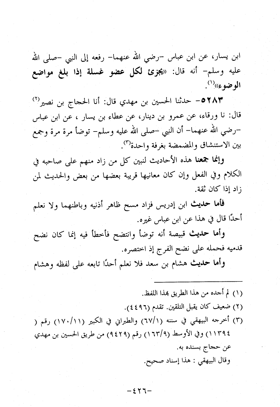 5283- حَدَّثنا الحسين بن مهدي، قال: أَخْبَرَنَا الحجاج بن نصير، قَال: حَدَّثنا وَرْقَاءُ عَنْ عَمْرو بْنِ دِينار، عَن عَطَاءِ بْنِ يَسَارٍ، عَنِ ابْنِ عَبَّاسٍ، رَضِي اللَّهُ عَنْهُمَا، أَنَّ النَّبيَّ صَلَّى اللَّهُ عَلَيه وَسَلَّم تَوَضَّأَ مَرَّةً مَرَّةً وَجَمَعَ بَيْنَ الاسْتِنْشَاقِ وَالْمَضْمَضَةِ بِغَرْفَةٍ وَاحِدَةٍ.
