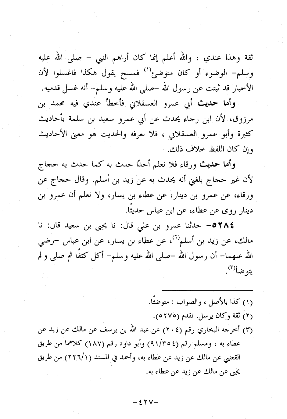 5284- حَدَّثنا عَمْرو بن علي، قَال: حَدَّثنا يَحْيَى بن سَعِيد، قَال: حَدَّثنا مَالِكٌ، عَن زَيد بْنِ أَسْلَمَ، عَن عَطاء بْنِ يَسَارٍ، عَنِ ابْنِ عَبَّاسٍ، رَضِي اللَّهُ عَنْهُمَا، أَنَّ رَسُولَ اللهِ صَلَّى اللَّهُ عَلَيه وَسَلَّم أَكَلَ كَتِفًا، ثُمَّ صَلَّى وَلَمْ يَتَوَضَّأَ.