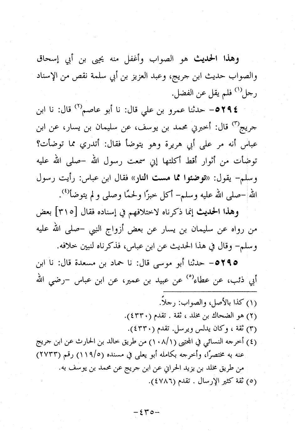 5294- حَدَّثنا عَمْرو بن علي، قَال: حَدَّثنا أَبُو عَاصِم، قَال: حَدَّثنا ابْنُ جُرَيج، قَال: أَخْبَرني مُحَمد بْنُ يُوسُف، عَن سُلَيْمَانَ بْنِ يَسَارٍ، عَنِ ابْنِ عَبَّاسٍ؛ أَنَّهُ مَرَّ عَلَى أَبِي هُرَيرة، وهُو يَتَوَضَّأُ، فَقَالَ: أَتَدْرِي مِمَّا تَوَضَّأْتُ؟ تَوَضَّأْتُ مِنْ أَثْوَارِ أَقْطٍ أَكَلْتُهَا، إِنِّي سمعتُ رَسُولَ اللَّهِ صَلَّى الله عَلَيه وَسَلَّم يقول: توضؤُوا مِمَّا مَسَّتِ النَّارُ فَقَالَ ابْنُ عَبَّاسٍ: رَأَيْتُ رَسُولَ اللَّهِ صَلَّى اللَّهُ عَلَيه وَسَلَّم أَكَلَ خُبْزًا وَلَحْمًا وَصَلَّى وَلَمْ يَتَوَضَّأْ.