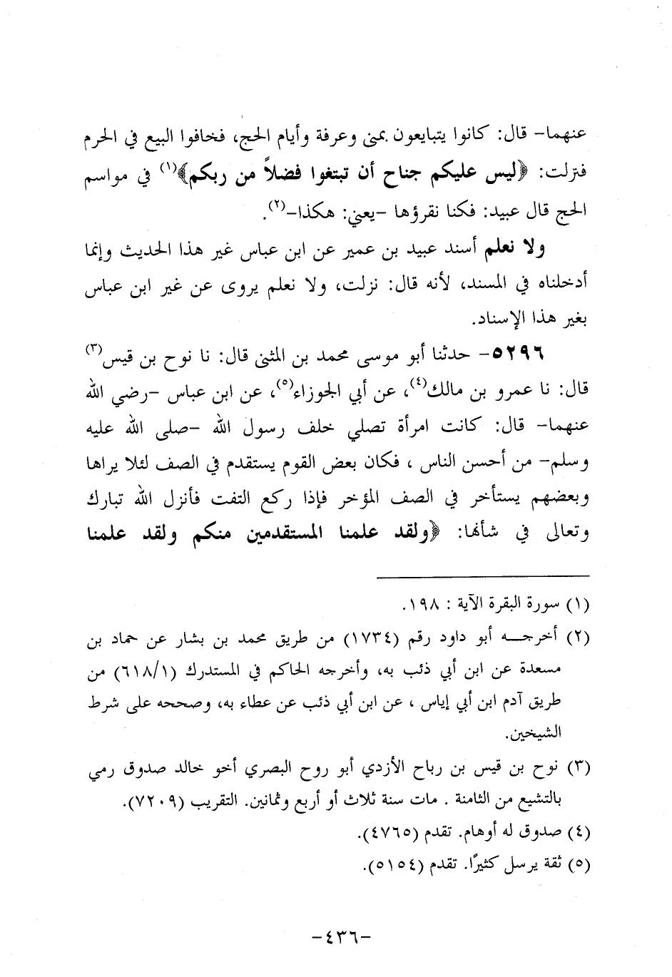 5296- حَدَّثنا أَبُو مُوسَى مُحَمد بْنُ الْمُثَنَّى، قَال: حَدَّثنا نوح بن قيس، قَال: حَدَّثنا عَمْرو بْنُ مَالِكٍ، عَن أَبِي الْجَوْزَاءِ، عَنِ ابْنِ عَبَّاسٍ، رَضِي اللَّهُ عَنْهُمَا، قَالَ: كَانَتْ امْرَأَةٌ تُصَلِّي خَلْفَ رَسُولِ اللَّهِ صَلَّى اللَّهُ عَلَيه وَسَلَّم مِنْ أَحْسَنِ النَّاسِ فَكَانَ بَعْضُ الْقَوْمِ يَسْتَقْدِمُ فِي الصَّفِّ لِئَلا يَرَاهَا وَبَعْضُهُمْ يَسْتَأِخُر فِي الصَّفِّ الْمُؤَخَّرِ فَإِذَا رَكَعَ الْتَفَتَ فَأَنْزَلَ اللَّهُ تَبَارَكَ وَتَعَالَى في شأنها: {وَلَقَدْ علمنا المستقدمين منكم ولقد علمنا المستأخرين} .