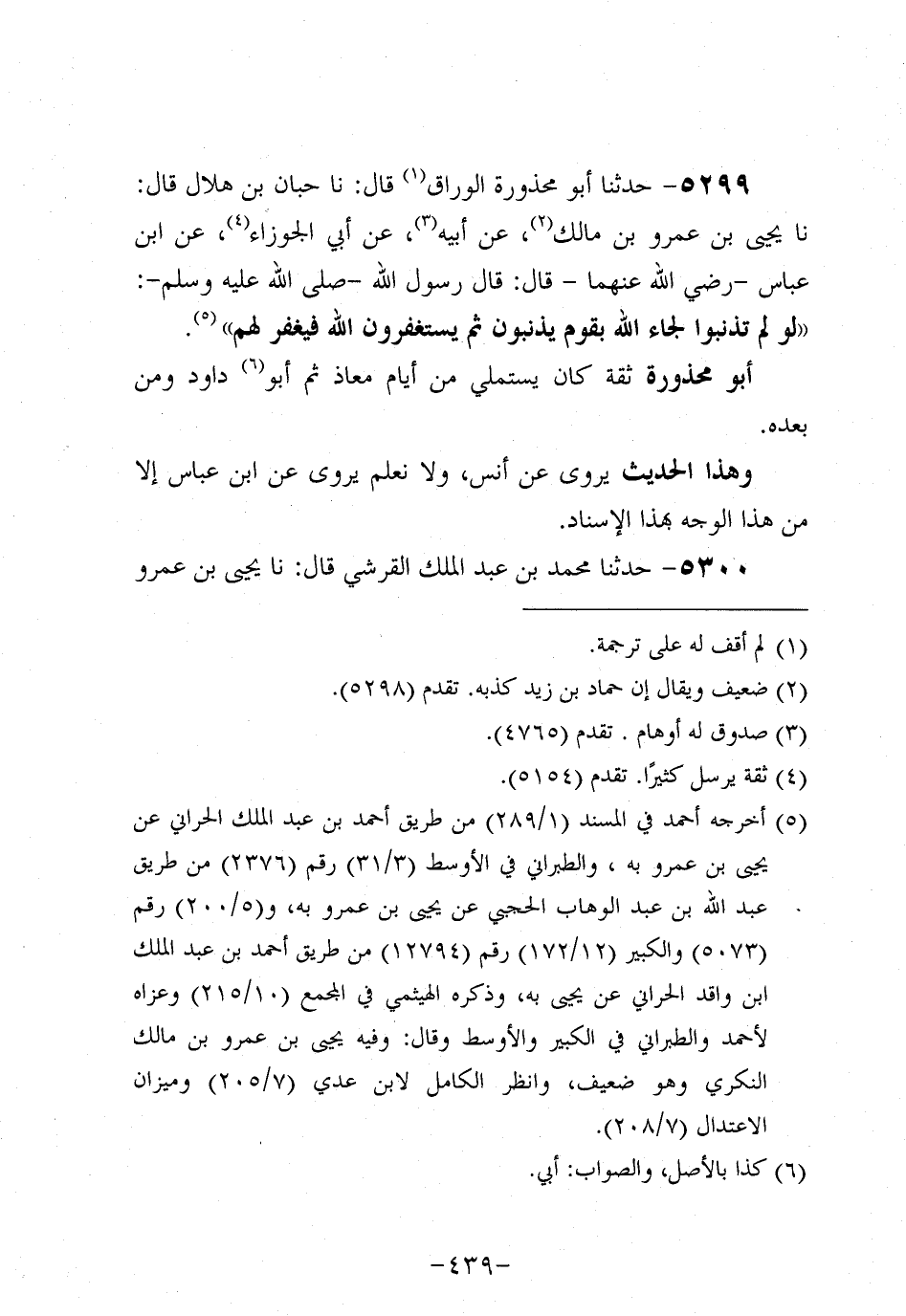 5299- حَدَّثنا أَبُو محذورة الوراق، قَال: حَدَّثنا حبان بن هلال، قَال: حَدَّثنا يَحْيَى بْنُ عَمْرو بْنِ مَالِكٍ، عَن أَبيهِ، عَن أَبِي الْجَوْزَاءِ، عَنِ ابْنِ عَبَّاسٍ، رَضِي اللَّهُ عَنْهُمَا، قَالَ: قَالَ رَسُول اللهِ صَلَّى اللَّهُ عَلَيه وَسَلَّم: لَوْ لَمْ تُذْنِبُوا لَجَاءَ اللَّهُ بِقَوْمٍ يُذْنِبُونَ، ثُمَّ يَسْتَغْفِرُونَ اللَّهَ فَيَغْفِرَ لَهُمْ.