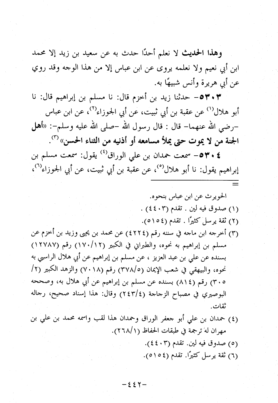 5304- سَمِعْتُ حَمْدَانَ بْنَ عَلِيٍّ الْوَرَّاقَ يقول: سمعت مسلم بن إبراهيم يقول: حَدَّثنا أَبُو هِلالٍ عَنْ عُقْبَة بْنِ أَبِي ثُبَيْت، عَن أَبِي الْجَوْزَاءِ، عَنِ ابْنِ عَبَّاسٍ بِنَحْوِهِ.