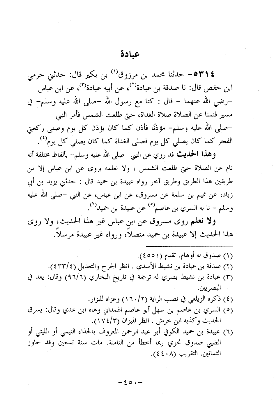 5314- حَدَّثنا مُحَمد بْنُ مَرْزُوقِ بْنِ بُكَيْرٍ قال: حدثني حرمي بن حفص، قَال: حَدَّثنا صَدَقَةُ بْنُ عُبَادَةَ، عَن أَبيهِ عُبَادَةَ، عَنِ ابْنِ عَبَّاسٍ، رَضِي اللَّهُ عَنْهُمَا، قَالَ: كُنَّا مَعَ رَسُولِ اللَّهِ صَلَّى اللَّهُ عَلَيه وَسَلَّم فِي مَسِيرٍ فَنِمْنَا عَنِ الصَّلاةِ صَلاةِ الْغَدَاةِ حَتَّى طَلَعَتِ الشَّمْسُ فَأَمَرَ النَّبِيّ صَلَّى اللَّهُ عَلَيه وَسَلَّم مُؤَذِّنًا فَأَذَّنَ كَمَا كَانَ يُؤَذِّنُ كُلَّ يَوْمٍ وَصَلَّى رَكْعَتَيِ الْفَجْرِ كَمَا كَانَ يُصَلِّي كُلَّ يَوْمٍ فَصَلَّى الْغَدَاةَ كَمَا كَانَ يُصَلِّي كُلَّ يَوْمٍ.