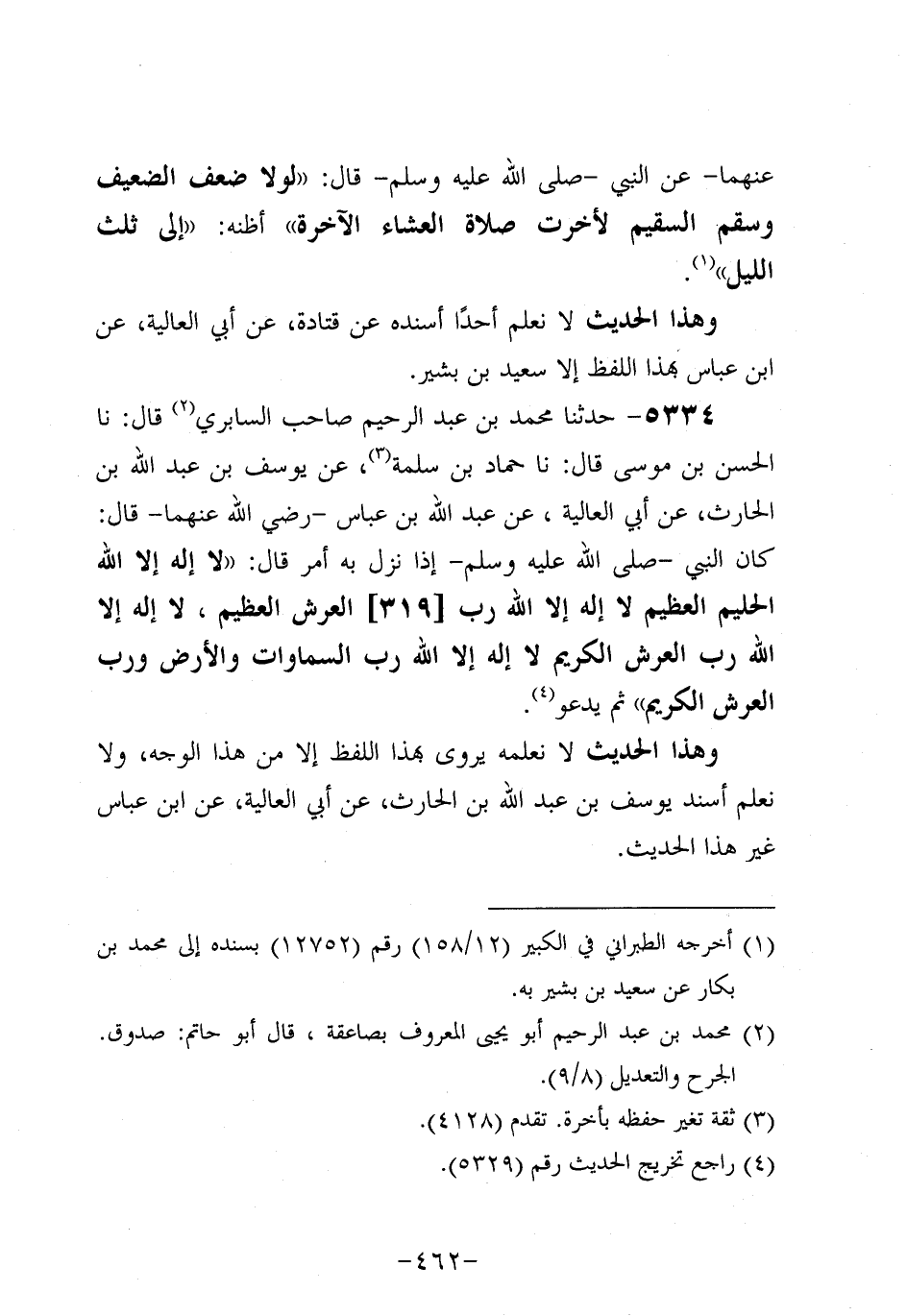 5334- حَدَّثنا مُحَمد بْنُ عَبد الرَّحِيمِ صَاحِبُ السَّابِرِيِّ، قَال: حَدَّثنا الحسن بن موسى، قَال: حَدَّثنا حَمَّادُ بْنُ سَلَمَة عَنْ يُوسُفَ بْنِ عَبد اللَّهِ بْنِ الْحَارِثِ، عَن أَبِي الْعَالِيَةِ عَنْ عَبد اللَّهِ بْنِ عَبَّاسٍ، رَضِي اللَّهُ عَنْهُمَا، قَالَ: كَانَ النَّبِيّ صَلَّى اللَّهُ عَلَيه وَسَلَّم إِذَا نَزَلَ بِهِ أَمْرٌ قَالَ: لا إِلَهَ إلاَّ اللَّهُ الْحَلِيمُ الْعَظِيمُ لا إِلَهَ إلاَّ اللَّهُ رَبُّ الْعَرْشِ الْعَظِيمُ لا إِلَهَ إلاَّ اللَّهُ رَبُّ الْعَرْشِ الْكَرِيمُ لا إِلَهَ إلاَّ الله رب السماوات وَالأَرْضِ وَرَبُّ الْعَرْشِ الْكَرِيمُ، ثُمَّ يَدْعُو.