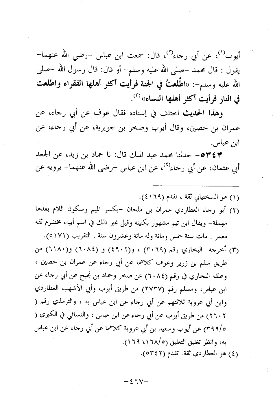 5343- حَدَّثنا مُحَمد بْنُ عَبد الْمَلِكِ قال: حَدَّثنا حَمَّادُ بْنُ زَيْدٍ، عَن الْجَعْدِ أَبِي عُثمَان، عَن أَبِي رَجَاءٍ، عَنِ ابْنِ عَبَّاسٍ، رَضِي اللَّهُ عَنْهُمَا، يَرْوِيهِ عَنِ النَّبِيّ صَلَّى اللَّهُ عَلَيه وَسَلَّم قَالَ: مَنْ رَأَى مِنْ أَمِيرِهِ شَيْئًا يَكْرَهُهُ فَلْيَصْبِرْ فَإِنَّهُ لَيْسَ أَحَدٌ يَتْرُكُ الْجَمَاعَةَ شِبْرًا فَيَمُوتُ إلاَّ مَاتَ مِيتَةَ جَاهِلِيَّةٍ.