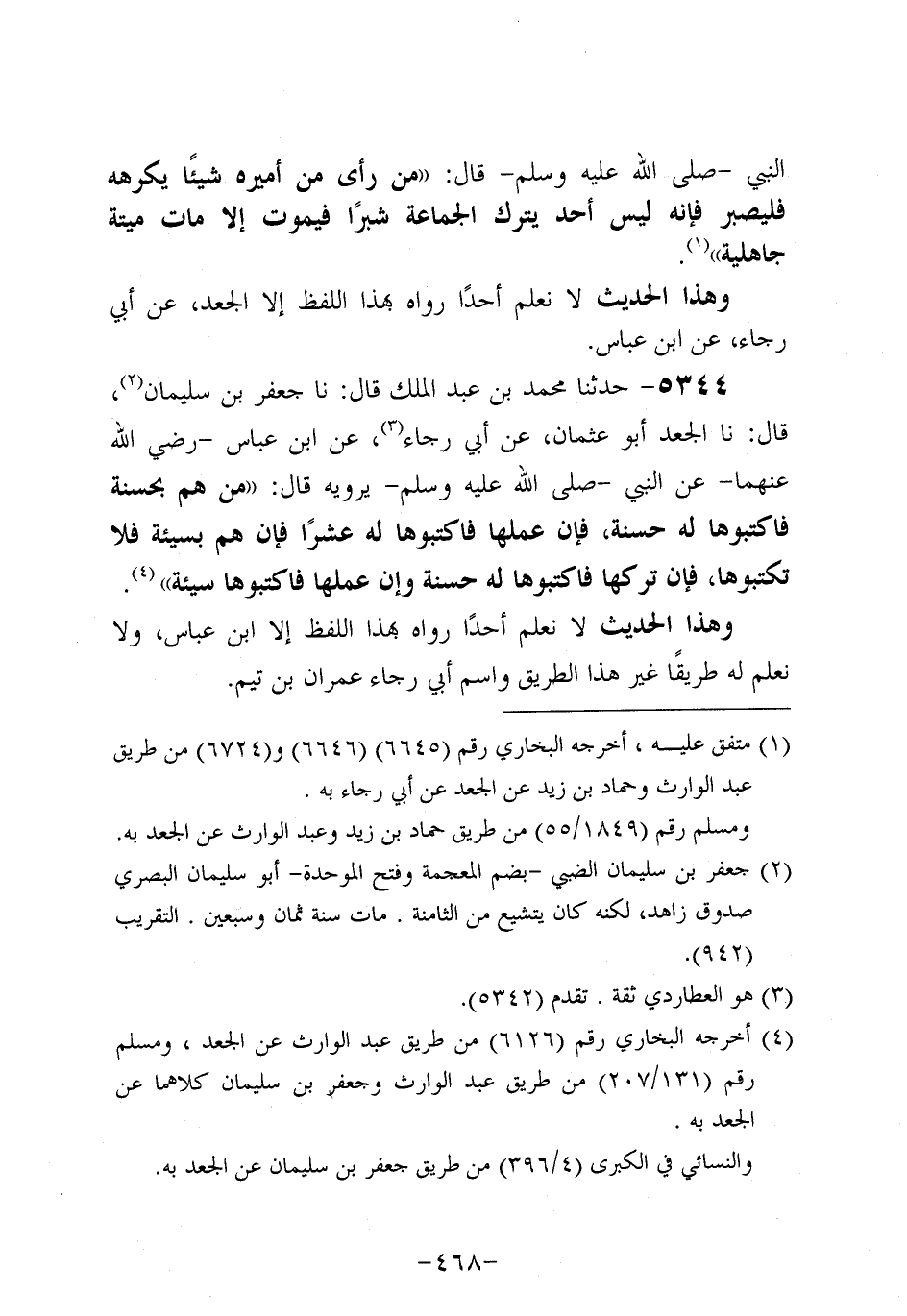 5344- حَدَّثنا مُحَمد بن عَبد الملك، قَال: حَدَّثنا جعفر بن سليمان، قَال: حَدَّثنا الْجَعْدُ أَبُو عُثمَان، عَن أَبِي رَجَاءٍ، عَنِ ابْنِ عَبَّاسٍ، رَضِي اللَّهُ عَنْهُمَا، عَنِ النَّبِيّ صَلَّى اللَّهُ عَلَيه وَسَلَّم يَرْوِيهِ قَالَ: مَنْ هَمَّ بِحَسَنَةٍ فَاكْتُبُوهَا لَهُ حَسَنَةً فَإِنْ عَمِلَهَا فَاكْتُبُوهَا لَهُ عَشْرًا فَإِنْ هَمَّ بِسَيِّئَةٍ فَلا تَكْتُبُوهَا فَإِنْ تَرَكَهَا فَاكْتُبُوهَا لَهُ حَسَنَةً، وَإن عَمِلَهَا فَاكْتُبُوهَا سَيِّئَةً.