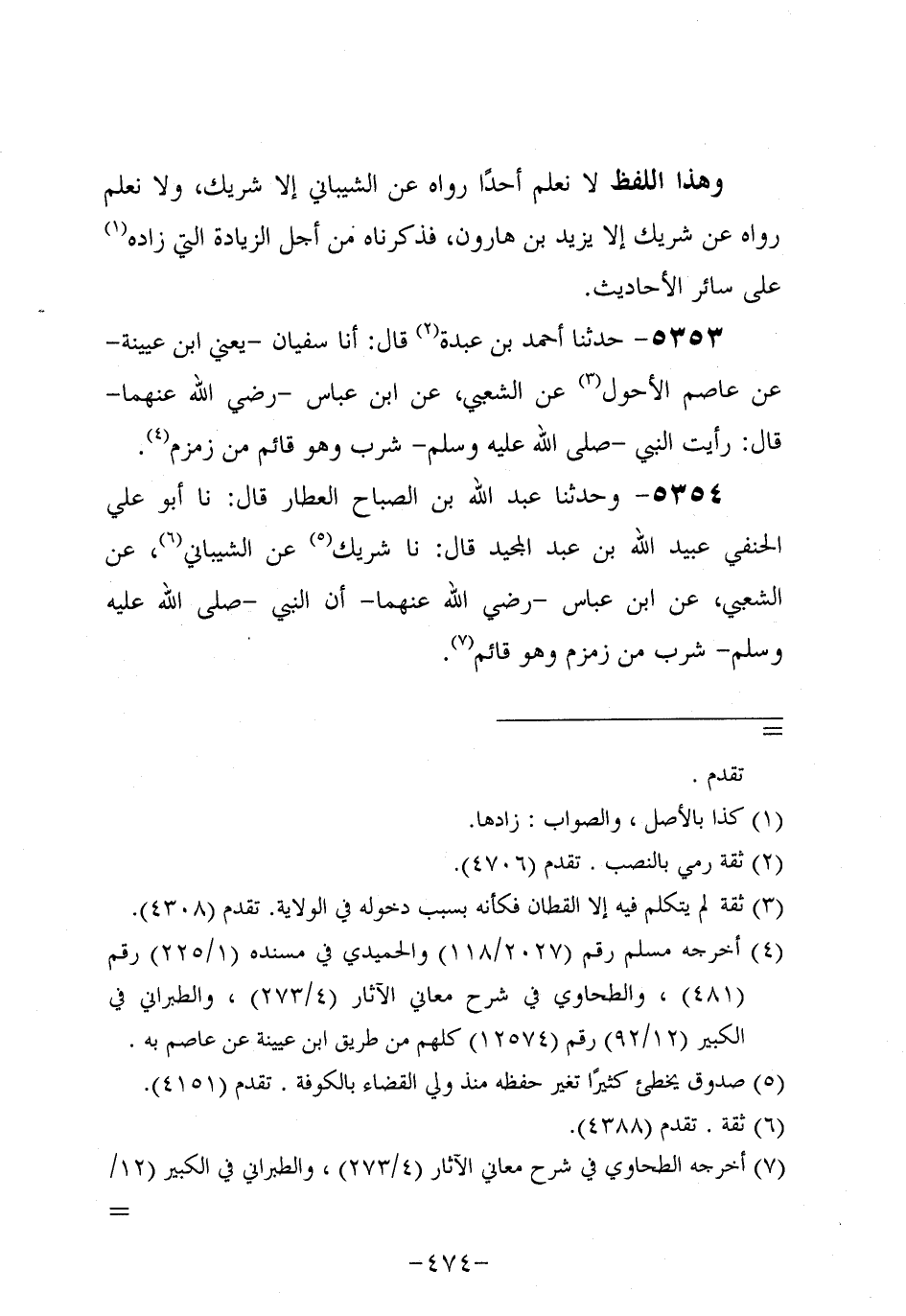 5353- حَدَّثنا أحمد بن عَبدة، قال: أَخْبَرَنَا سُفيان، يَعْنِي ابْنَ عُيَيْنة، عَنْ عَاصِم الأَحْوَلِ، عَن الشَّعبِيّ، عَنِ ابْنِ عَبَّاسٍ، رَضِي اللَّهُ عَنْهُمَا، قَالَ: رَأَيْتُ النَّبِيّ صَلَّى اللَّهُ عَلَيه وَسَلَّم شَرِبَ، وهُو قَائِمٌ مِنْ زَمْزَمَ.