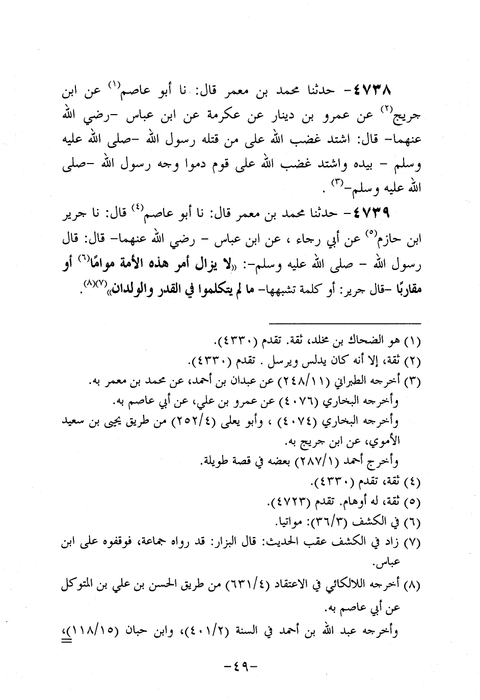 4739-حَدَّثنا مُحَمد بن مَعْمَر، قَال: حَدَّثنا أَبُو عَاصِم، قَال: حَدَّثنا جَرِيرُ بْنُ حَازِمٍ، عَن أَبِي رَجَاءٍ، عَنِ ابْنِ عَبَّاسٍ، رَضِي اللَّهُ عَنْهُمَا، قَالَ: قَالَ رَسُول اللهِ صَلَّى اللَّهُ عَلَيه وَسَلَّم: لا يزال أمر هذه الأمة مُؤامًّا (1) ، أَوْ مُقَارِبًا (قَالَ جَرِيرٌ، أَوْ كَلِمَةٌ تُشْبِهُهَا) ما لم يتكلموا في القدر والولدان.