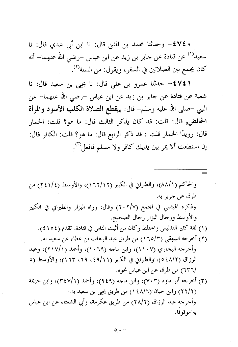 4741- حَدَّثنا عَمْرو بن علي، قَال: حَدَّثنا يَحْيَى بن سَعِيد، قَال: حَدَّثنا شُعْبَةُ، عَن قَتَادَةَ، عَنْ جَابِرِ بْنِ زَيْدٍ، عَنِ ابْنِ عَبَّاسٍ، رَضِي اللَّهُ عَنْهُمَا، عَنِ النَّبِيّ صَلَّى اللَّهُ عَلَيه وَسَلَّم قَالَ: يَقْطَعُ الصَّلاةَ الْكَلْبُ الأَسْوَدُ وَالْمَرْأَةُ الْحَائِضُ قَالَ: قُلْتُ: قَدْ كَانَ يَذْكُرُ الثَّالِث قَالَ: مَا هُوَ؟ قُلْتُ: الْحِمَارُ، قَالَ: رُوَيْدًا الْحِمَارُ قُلْتُ: قَدْ ذَكَرَ الرَّابِعَ قَالَ: مَا هُوَ؟ قُلْتُ: الْكَافِرُ قَالَ: إِنِ اسْتَطَعْتَ أَلا يَمُرَّ بَيْنَ يَدَيْكَ كَافِرٌ، ولاَ مُسْلِمٌ فَافْعَلْ.