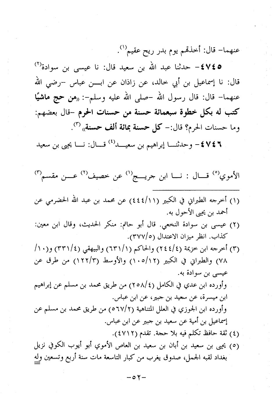 4745- حَدَّثنا عَبد الله بن سَعِيد، قَال: حَدَّثنا عيسى بن سوادة، قَال: حَدَّثنا إِسْمَاعِيلُ بْنُ أَبِي خَالِدٍ، عَن زَاذَانَ، عَنِ ابْنِ عَبَّاسٍ، رَضِي اللَّهُ عَنْهُمَا، قَالَ: قَالَ رَسُول اللهِ صَلَّى اللَّهُ عَلَيه وَسَلَّم: مِنْ حج ماشيا كتب له بكل خطوة سبعمِئَة حَسَنَةٍ مِنْ حَسَنَاتِ الْحَرَمِ، قَالَ بعضُهم: وَمَا حسناتُ الحرم؟ قال: كُلُّ حسنةٍ بمِئَة ألف حسنةٍ.