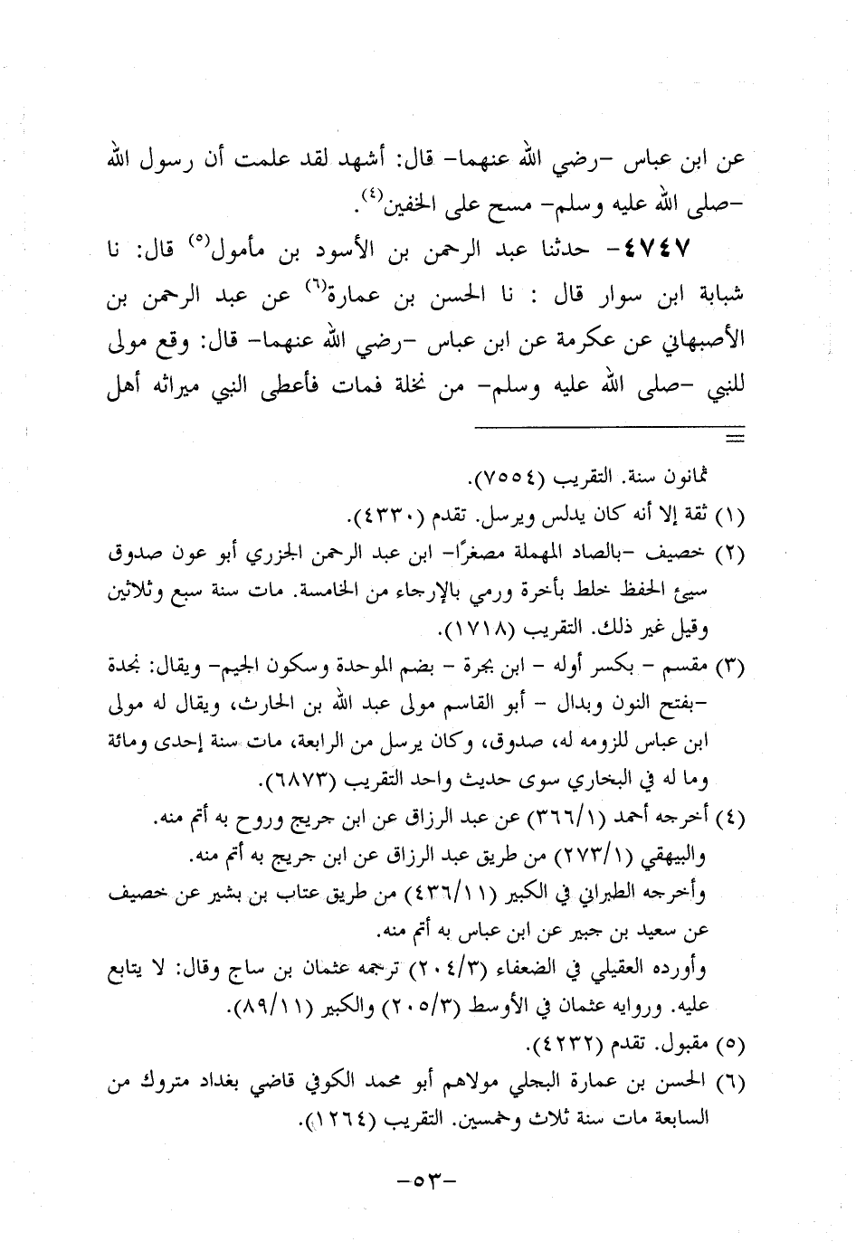 4747- حَدَّثنا عَبد الرَّحْمَنِ بْنُ الأَسْوَدِ بْنِ مَأْمُولٍ، قَال: حَدَّثنا شبابة بن سوار، قَال: حَدَّثنا الْحَسَنُ بْنُ عُمَارَةَ عَنْ عَبد الرَّحْمَنِ بْنِ الأَصْبَهَانِيِّ، عَن عِكْرِمة، عَنِ ابْنِ عَبَّاسٍ، رَضِي اللَّهُ عَنْهُمَا، قَالَ: وَقَعَ مَوْلًى لِلنَّبِيِّ صَلَّى اللَّهُ عَلَيه وَسَلَّم مِنْ نَخْلَةٍ فَمَاتَ فَأَعْطَى النَّبِيّ مِيرَاثَهُ أَهْلَ دِينِهِ.