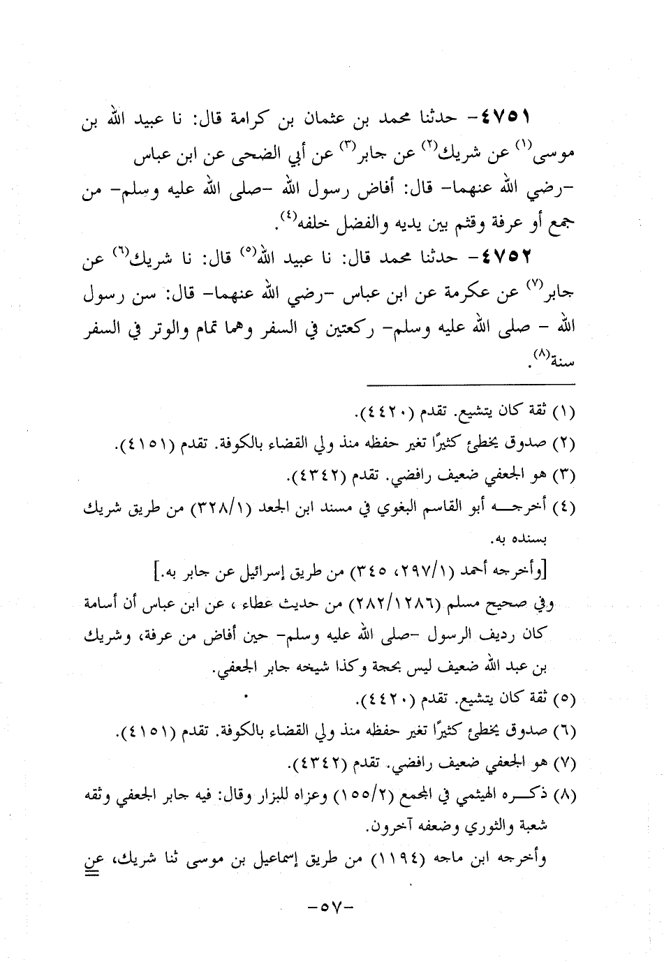 4751- حَدَّثنا مُحَمد بْنُ عُثمَان بْنِ كَرَامَةَ، قَال: حَدَّثنا عُبَيد اللَّهِ بْنُ مُوسَى، عَنْ شَرِيكٍ عَنْ جَابِرٍ، عَن أَبِي الضُّحَى، عَنِ ابْنِ عَبَّاسٍ، رَضِي اللَّهُ عَنْهُمَا، قَالَ: أَفَاضَ رَسُولُ اللَّهِ صَلَّى اللَّهُ عَلَيه وَسَلَّم مِنْ جَمْعٍ، أَوْ عَرَفَةَ وَقُثَمُ بَيْنَ يَدَيْهِ وَالْفَضْلُ خَلْفَهُ.
