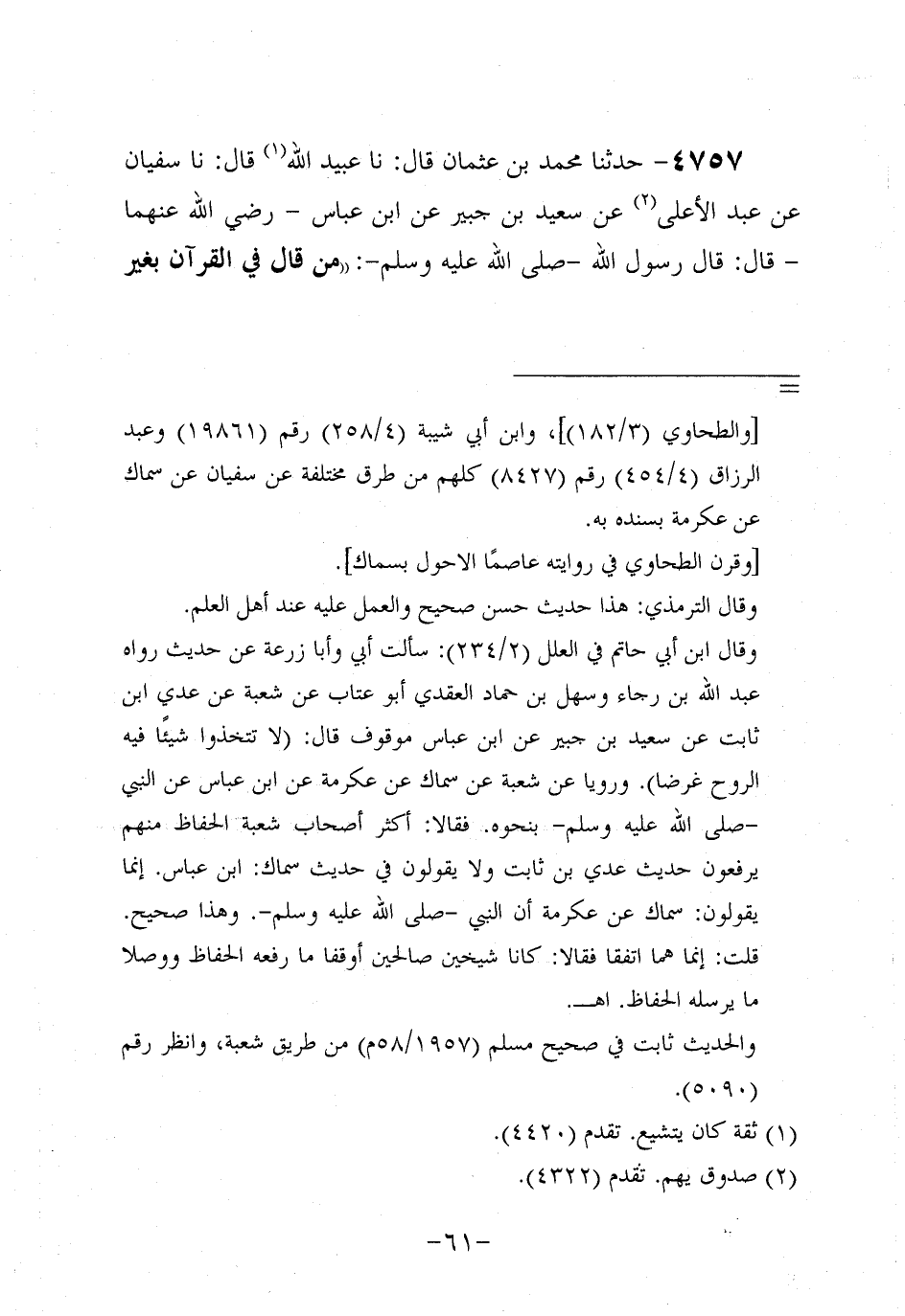 4757- حَدَّثنا مُحَمد بن عُثمَان، قَال: حَدَّثنا عُبَيد الله، قَال: حَدَّثنا سُفيان، عَن عَبد الأَعْلَى، عَن سَعِيد بْنِ جُبَير، عَنِ ابْنِ عَبَّاسٍ، رَضِي اللَّهُ عَنْهُمَا، قَالَ: قَالَ رَسُول اللهِ صَلَّى اللَّهُ عَلَيه وَسَلَّم: مَنْ قَالَ فِي الْقُرْآنِ بِغَيْرِ عِلْمٍ فَلْيَتَبَوَّأْ مَقْعَدَهُ مِنَ النَّارِ.