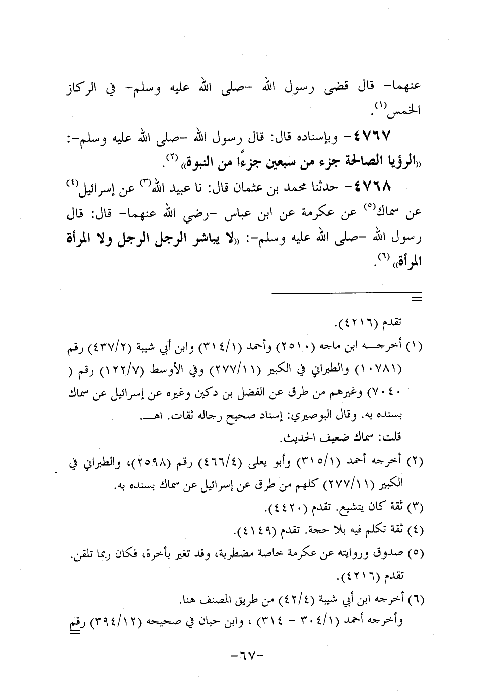 4768- حَدَّثنا مُحَمد بن عُثمَان، قَال: حَدَّثنا عُبَيد اللَّهِ، عَن إِسْرَائِيلَ، عَن سِمَاك، عَن عِكْرِمة، عَنِ ابْنِ عَبَّاسٍ، رَضِي اللَّهُ عَنْهُمَا، قَالَ: قَالَ رَسُول اللهِ صَلَّى اللَّهُ عَلَيه وَسَلَّم: لا يُبَاشِرِ الرَّجُلُ الرَّجُلَ، ولاَ الْمَرْأَةُ الْمَرْأَةَ.