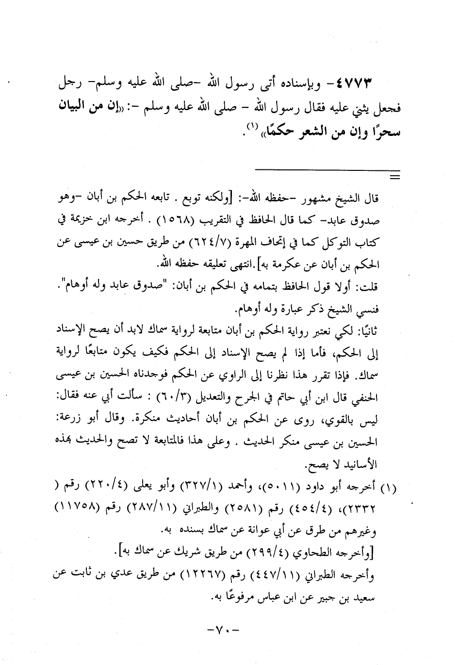 4773- وَبِإِسْنَادِهِ أَتَى رَسُولَ اللَّهِ صَلَّى اللَّهُ عَلَيه وَسَلَّم رَجُلٌ فَجَعَلَ يُثْنِي عَلَيْهِ فَقَالَ رَسُولُ اللَّهِ صَلَّى اللَّهُ عَلَيه وَسَلَّم: إِنَّ مِنَ الْبَيَانِ سِحْرًا، وَإن مِنَ الشِّعْرِ حِكَمًا.