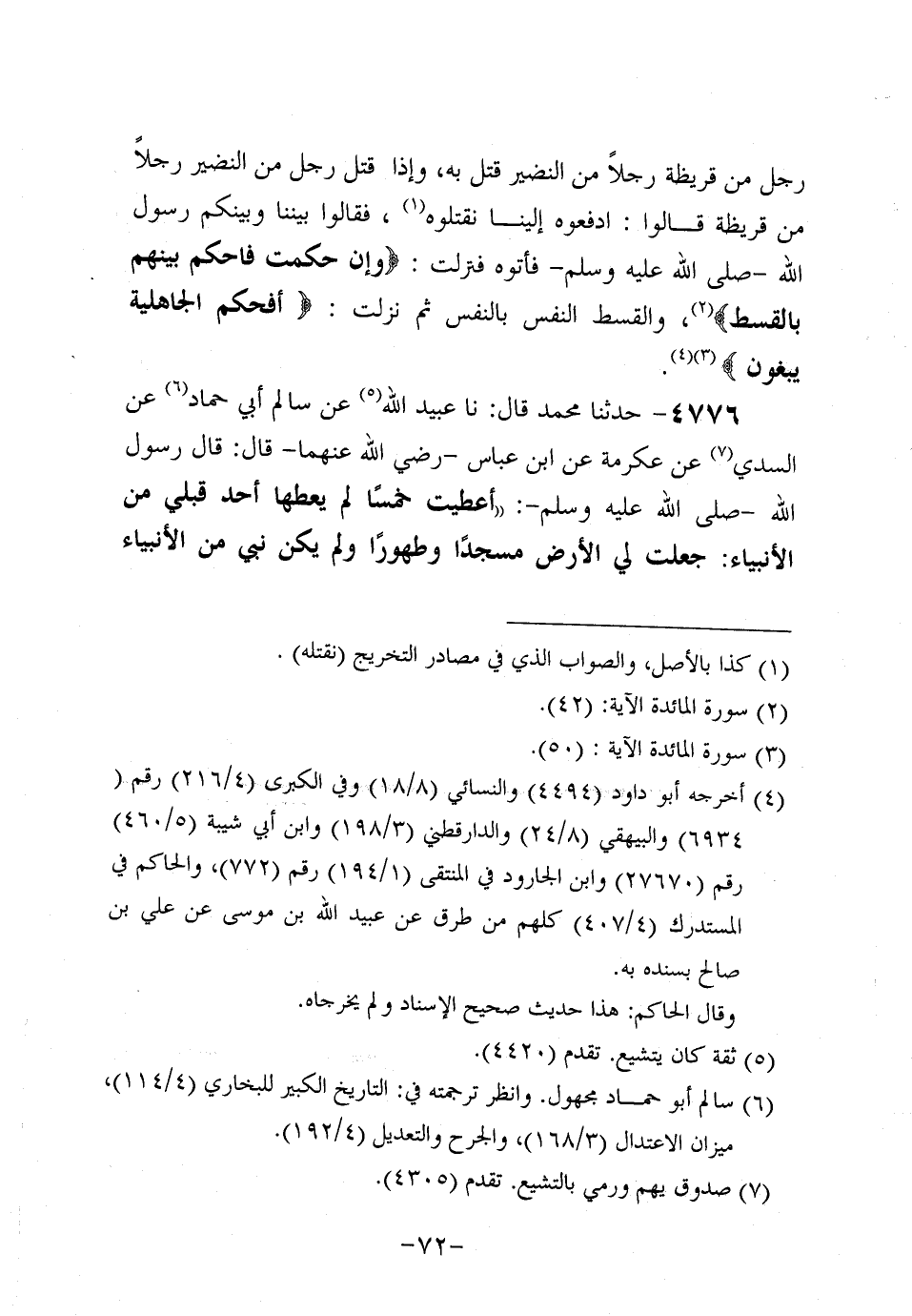 4776- حَدَّثنا مُحَمد، قَال: حَدَّثنا عُبَيد اللَّهِ، عَن سَالِمٍ أَبِي حَمَّادٍ عَنِ السُّدِّي، عَن عِكْرِمة، عَنِ ابْنِ عَبَّاسٍ، رَضِي اللَّهُ عَنْهُمَا، قَالَ: قَالَ رَسُول اللهِ صَلَّى اللَّهُ عَلَيه وَسَلَّم: أُعْطِيتُ خَمْسًا لَمْ يُعْطَهَا أَحَدٌ قَبْلِي مِنَ الأَنْبِيَاءِ: جُعِلَتْ لِيَ الأَرْضُ مَسْجِدًا وَطَهُورًا وَلَمْ يَكُنْ نَبِيٌّ مِنَ الأَنْبِيَاءِ يُصَلِّي حَتَّى يَبْلُغَ مِحْرَابَهُ وَنُصِرْتُ بِالرُّعْبِ مَسِيرَةَ شَهْرٍ يَكُونُ بَيْنَ يَدَيَّ إِلَى الْمُشْرِكِينَ فَيَقْذِفُ اللَّهَ الرُّعْبَ فِي قُلُوبِهِمْ، وَكان النَّبِيّ يُبْعَثُ إِلَى خَاصَّةِ قَوْمِهِ وَبُعِثْتُ أَنَا إِلَى الْجِنِّ وَالإِنْسِ وَكَانَتِ الأَنْبِيَاءُ يَعْزِلُونَ الْخُمُسَ فَتَجِيءُ النَّارُ فَتَأْكُلُهُ وَأُمِرْتُ أَنْ أُقَسِّمَهَا فِي فُقَرَاءِ أُمَّتِي وَلَمْ يَبْقَ نَبِيٌّ إلاَّ قَدْ أُعْطِيَ شَفَاعَةً وَأَخَّرْتُ أَنَا شَفَاعَتِي لأُمَّتِي.
