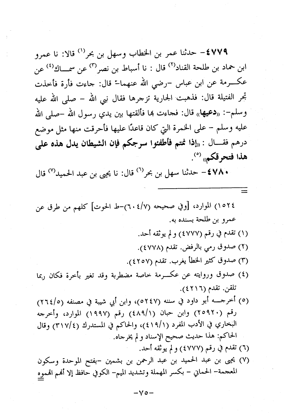 4779- حَدَّثنا عُمَر بْنُ الْخَطَّابِ وَسَهْلُ بْنُ بَحْرٍ قالا: حَدَّثنا عَمْرو بْنُ حَمَّادِ بْنِ طَلْحَةَ الْقَنَّادُ قَالَ: أَسْبَاطُ بْنُ نَصْرٍ عَنْ سِمَاك، عَن عِكْرِمة، عَنِ ابْنِ عَبَّاسٍ، رَضِي اللَّهُ عَنْهُمَا، قَالَ: جَاءَتْ فَأْرَةٌ فَأَخَذَتْ تَجُرُّ الْفَتِيلَةَ قَالَ: فَذَهَبَتِ الْجَارِيَةُ تَزْجُرُهَا فَقَالَ نَبِيُّ اللَّهِ صَلَّى اللَّهُ عَلَيه وَسَلَّم: دَعِيهَا قَالَ: فَجَاءَتْ بِهَا فَأَلْقَتْهَا بَيْنَ يَدَيْ رَسُولِ اللَّهِ صَلَّى اللَّهُ عَلَيه وَسَلَّم عَلَى الْخَمْرَةِ الَّتِي كَانَ قَاعِدًا عَلَيْهَا فَأَحْرَقَتْ مِنْهَا مِثْلَ مَوْضِعِ دِرْهَمٍ فَقَالَ: إِذَا نِمْتُمْ فَأَطْفِئُوا سُرُجَكُمْ فَإِنَّ الشَّيْطَانَ يَدُلُّ هَذِهِ عَلَى هَذَا فَتَحْرِقَكُمْ.