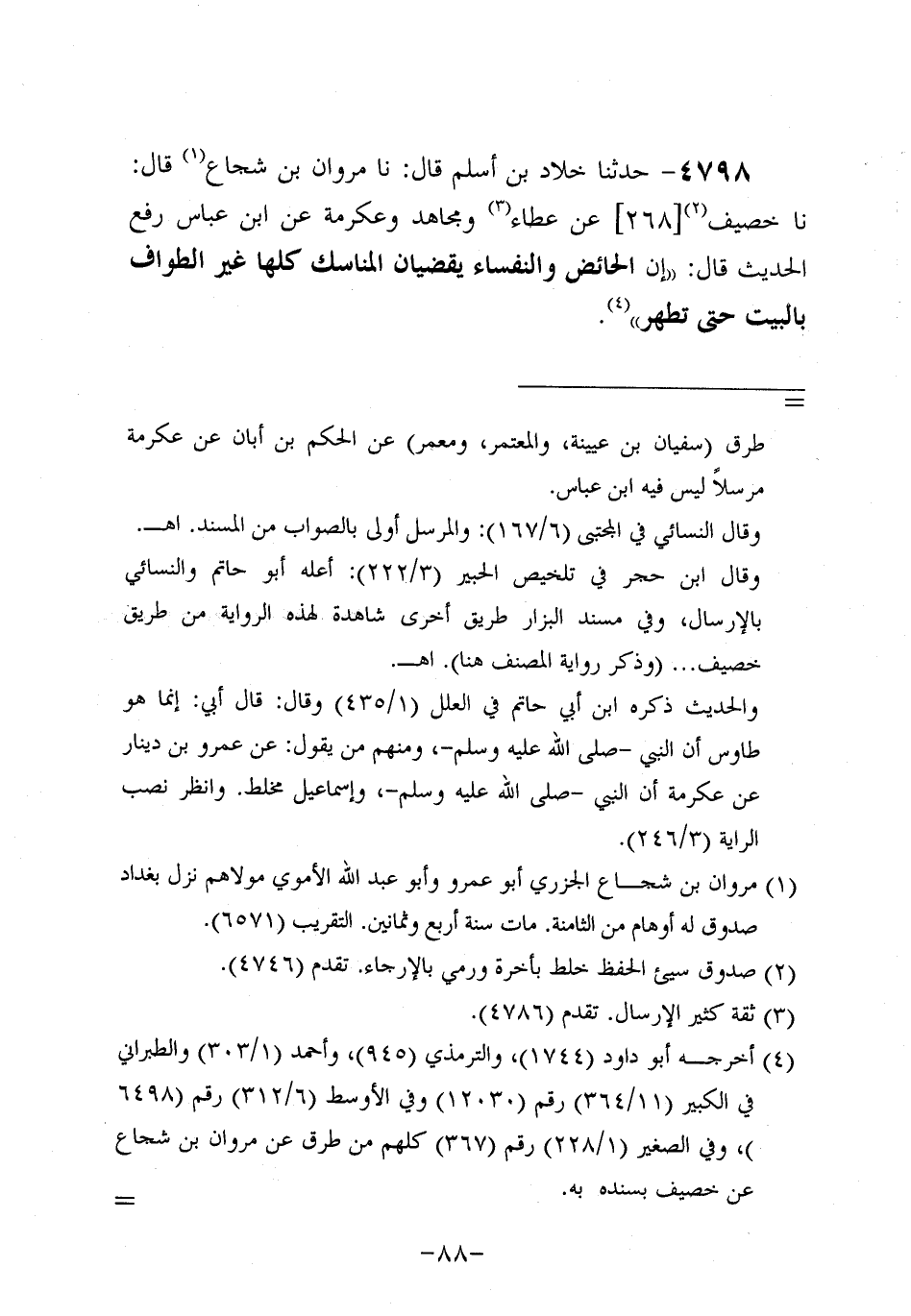 4798- حَدَّثنا خلاد بن أسلم، قَال: حَدَّثنا مَرْوَان بن شُجَاع، قَال: حَدَّثنا خُصَيف، عَن عَطاء وَمُجَاهِدٍ وَعِكْرِمَةَ، عَنِ ابْنِ عَبَّاسٍ رَفَعَ الْحَدِيثَ قَالَ: إِنَّ الْحَائِضَ وَالنُّفَسَاءَ يَقْضِيَانِ الْمَنَاسِكَ كُلَّهَا غَيْرَ الطَّوَافِ بِالْبَيْتِ حَتَّى تطهر.