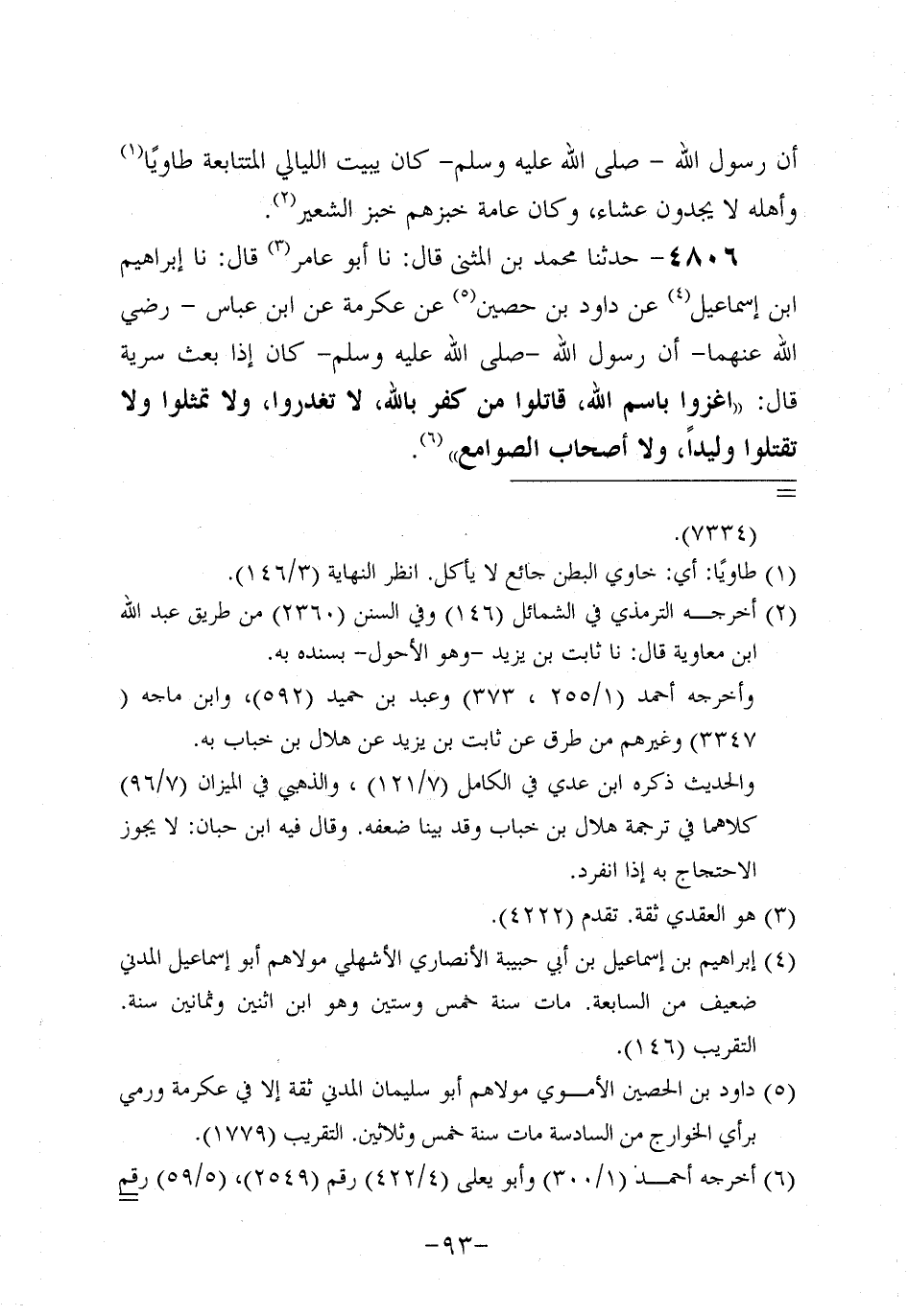 4806- حَدَّثنا مُحَمَّدُ بْنَ الْمُثَنَّى، قَال: حَدَّثنا أَبُو عامر، قَال: حَدَّثنا إِبْرَاهِيمُ بْنُ إِسْمَاعِيلَ، عَن دَاود بْنِ حُصَيْنٍ، عَن عِكْرِمة، عَنِ ابْنِ عَبَّاسٍ، رَضِي اللَّهُ عَنْهُمَا، أَنَّ رَسُولَ اللهِ صَلَّى اللَّهُ عَلَيه وَسَلَّم كَانَ إِذَا بَعَثَ سَرِيَّةً قَالَ: اغْزُوا بِاسْمِ اللَّهِ قَاتِلُوا مَنْ كَفَرَ بِاللَّهِ لا تَغْدُرُوا، ولاَ تُمَثِّلُوا، ولاَ تَقْتُلُوا وَلِيدًا، ولاَ أصحاب الصوامع.
