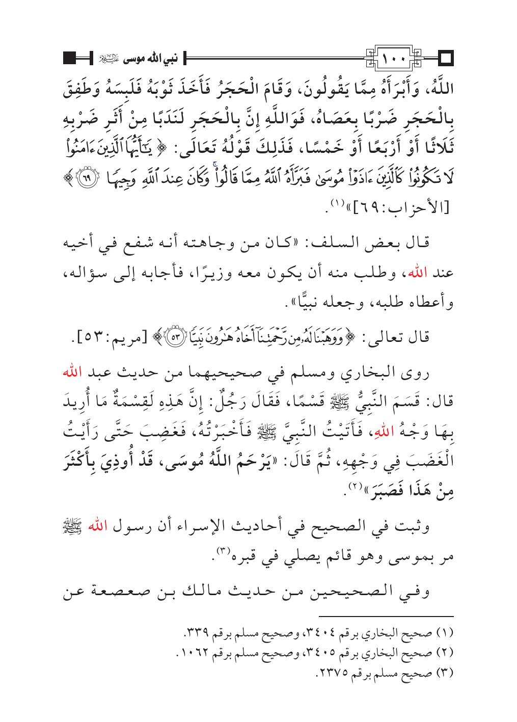 اللَّهُ، وَأَبْرَأَهُ مِمَّا يَقُولُونَ، وَقَامَ الْحَجَرُ فَأَخَذَ ثَوْبَهُ فَلَبِسَهُ وَطَفِقَ بِالْحَجَرِ ضَرْبًا بِعَصَاهُ، فَوَاللَّهِ إِنَّ بِالْحَجَرِ لَنَدَبًا مِنْ أَثَرِ ضَرْبِهِ ثَلَاثًا أَوْ أَرْبَعًا أَوْ خَمْسًا، فَذَلِكَ قَوْلُهُ تَعَالَى: {الَّذِينَ لَا تَكُونُوا كَالَّذِينَ آذَوْا مُوسَى فَبَرَّأَهُ اللَّهُ مِمَّا قَالُوا وَكَانَ عِنْدَ اللَّهِ وَجِيهًا (٦٩)} [الأحزاب:٦٩]» (¬١).