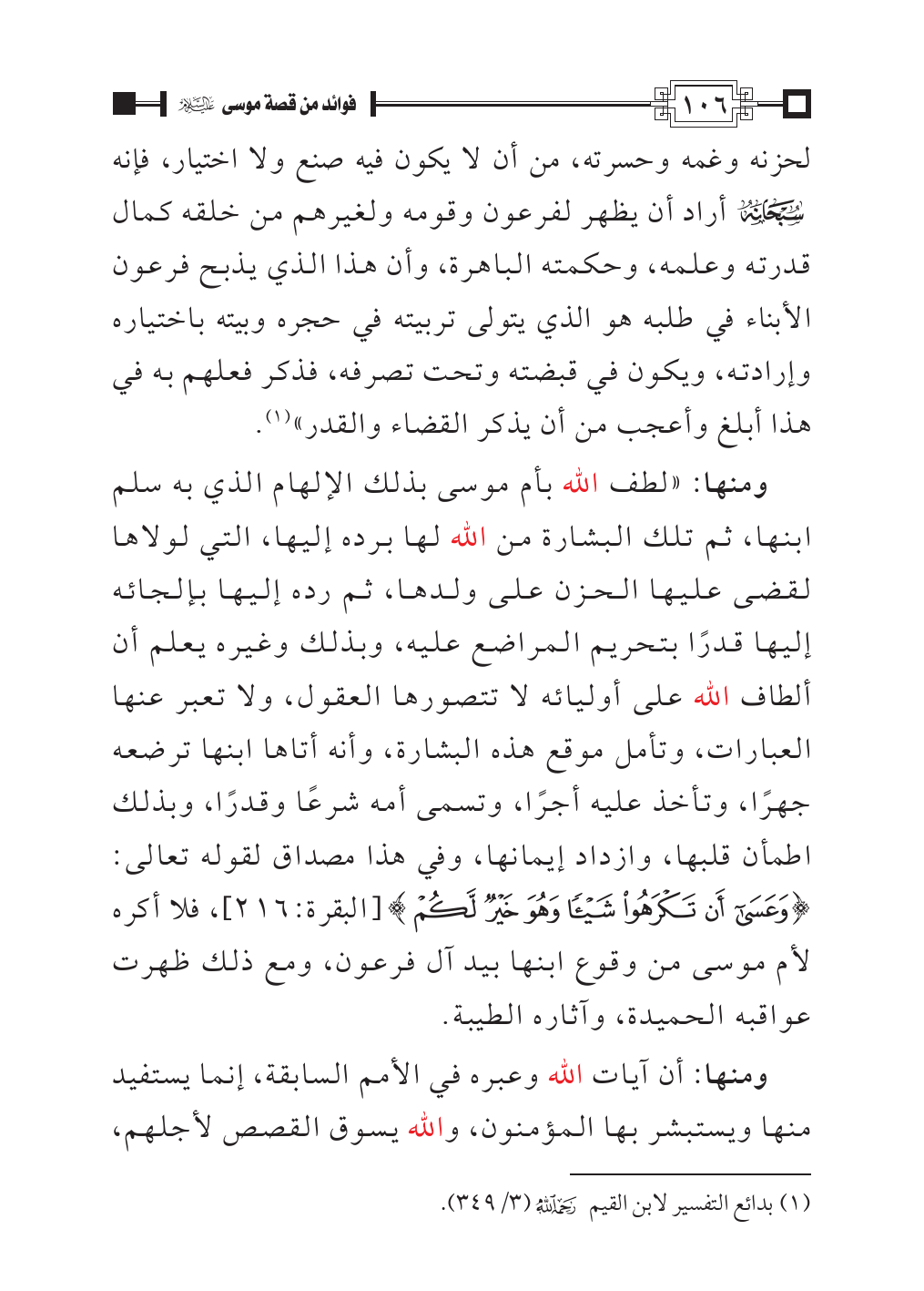 ومنها: «لطف الله بأم موسى بذلك الإلهام الذي به سلم ابنها، ثم تلك البشارة من الله لها برده إليها، التي لولاها لقضى عليها الحزن على ولدها، ثم رده إليها بإلجائه إليها قدرًا بتحريم المراضع عليه، وبذلك وغيره يعلم أن ألطاف الله على أوليائه لا تتصورها العقول، ولا تعبر عنها العبارات، وتأمل موقع هذه البشارة، وأنه أتاها ابنها ترضعه جهرًا، وتأخذ عليه أجرًا، وتسمى أمه شرعًا وقدرًا، وبذلك اطمأن قلبها، وازداد إيمانها، وفي هذا مصداق لقوله تعالى: {وَعَسَى أَنْ تَكْرَهُوا شَيْئًا وَهُوَ خَيْرٌ لَكُمْ} [البقرة:٢١٦]، فلا أكره لأم موسى من وقوع ابنها بيد آل فرعون، ومع ذلك ظهرت عواقبه الحميدة، وآثاره الطيبة.