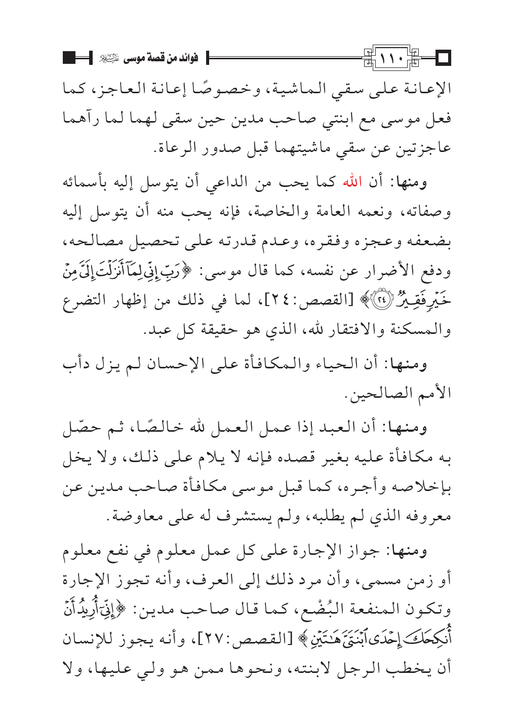 ومنها: أن العبد إذا عمل العمل لله خالصًا، ثم حصّل به مكافأة عليه بغير قصده فإنه لا يلام على ذلك، ولا يخل بإخلاصه وأجره، كما قبل موسى مكافأة صاحب مدين عن معروفه الذي لم يطلبه، ولم يستشرف له على معاوضة.