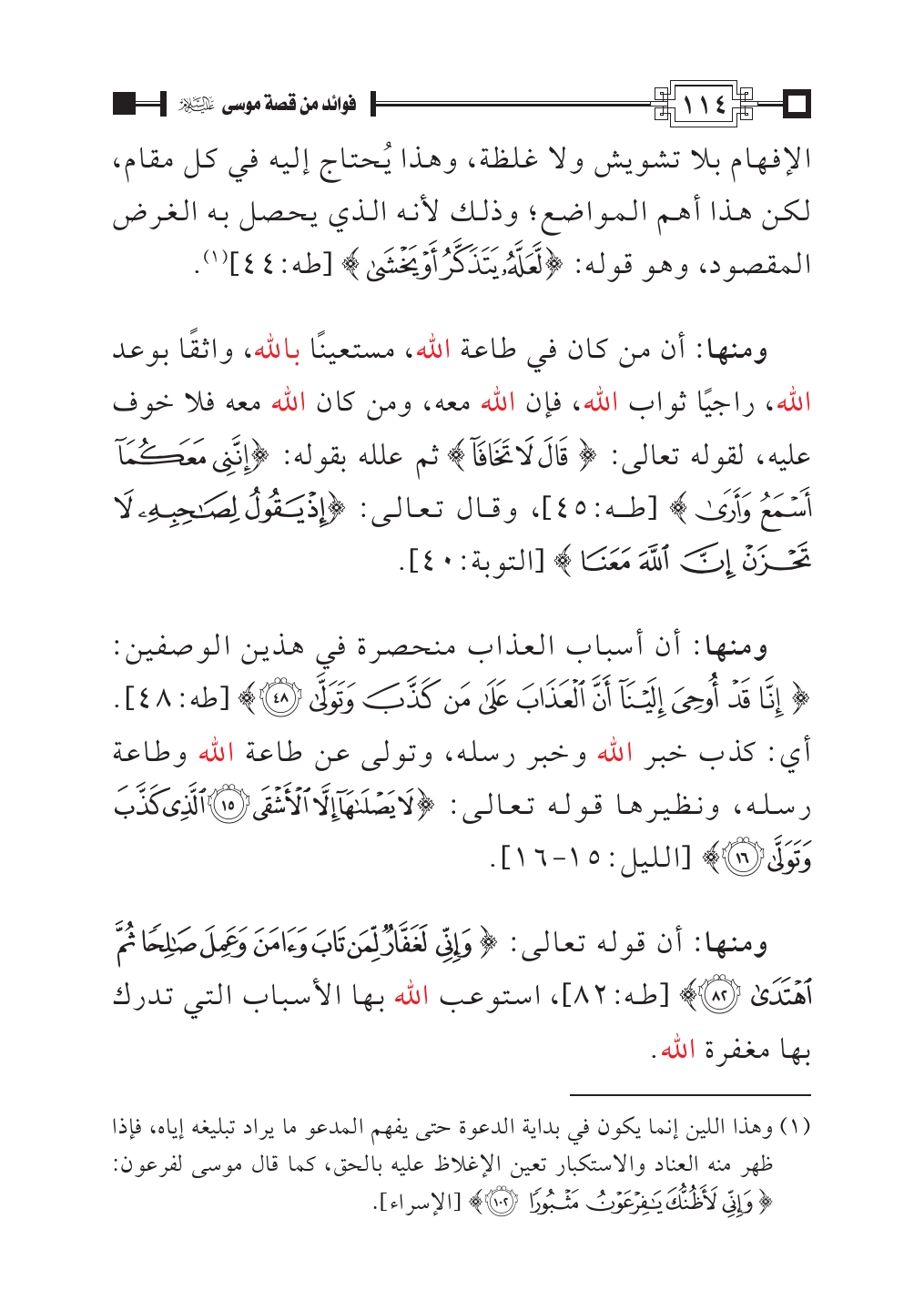 الإفهام بلا تشويش ولا غلظة، وهذا يُحتاج إليه في كل مقام، لكن هذا أهم المواضع؛ وذلك لأنه الذي يحصل به الغرض المقصود، وهو قوله: {لَعَلَّهُ يَتَذَكَّرُ أَوْ يَخْشَى} [طه:٤٤] (¬١).