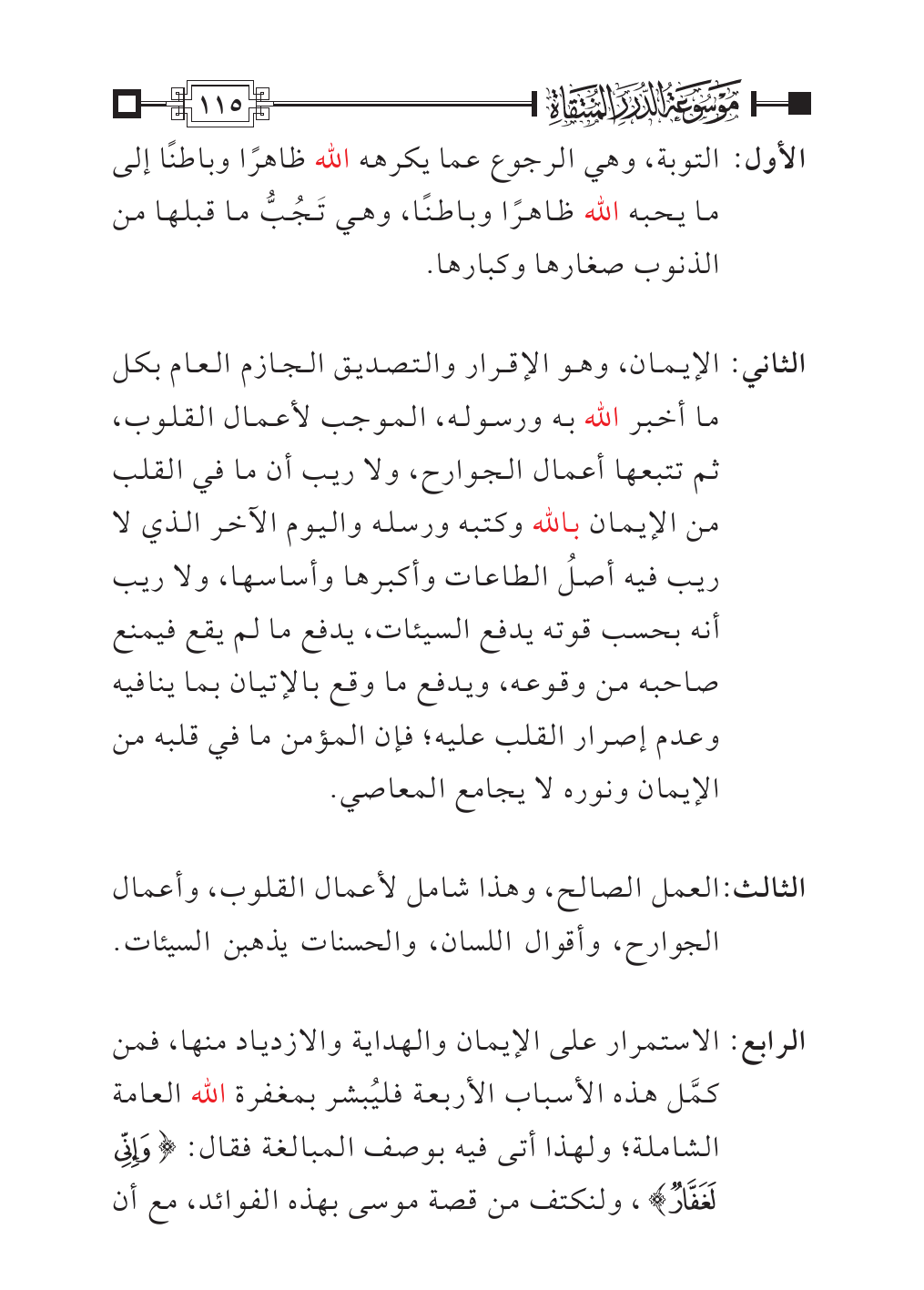 الرابع: الاستمرار على الإيمان والهداية والازدياد منها، فمن كمَّل هذه الأسباب الأربعة فليُبشر بمغفرة الله العامة الشاملة؛ ولهذا أتى فيه بوصف المبالغة فقال: {لَغَفَّارٌ}، ولنكتف من قصة موسى بهذه الفوائد، مع أن