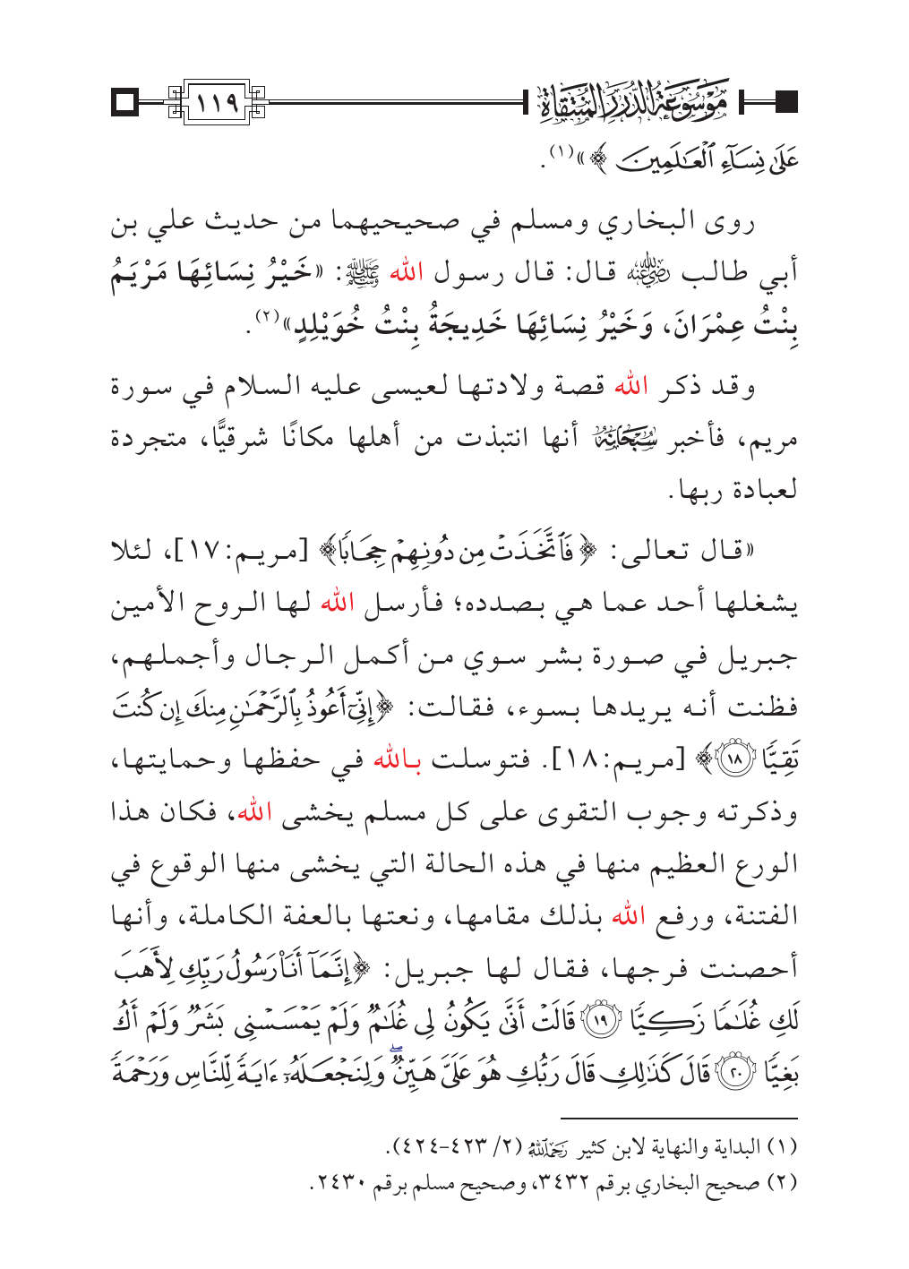 روى البخاري ومسلم في صحيحيهما من حديث علي بن أبي طالب - رضي الله عنه - قال: قال رسول الله - صلى الله عليه وسلم -: «خَيْرُ نِسَائِهَا مَرْيَمُ بِنْتُ عِمْرَانَ، وَخَيْرُ نِسَائِهَا خَدِيجَةُ بِنْتُ خُوَيْلِدٍ» (¬٢).
