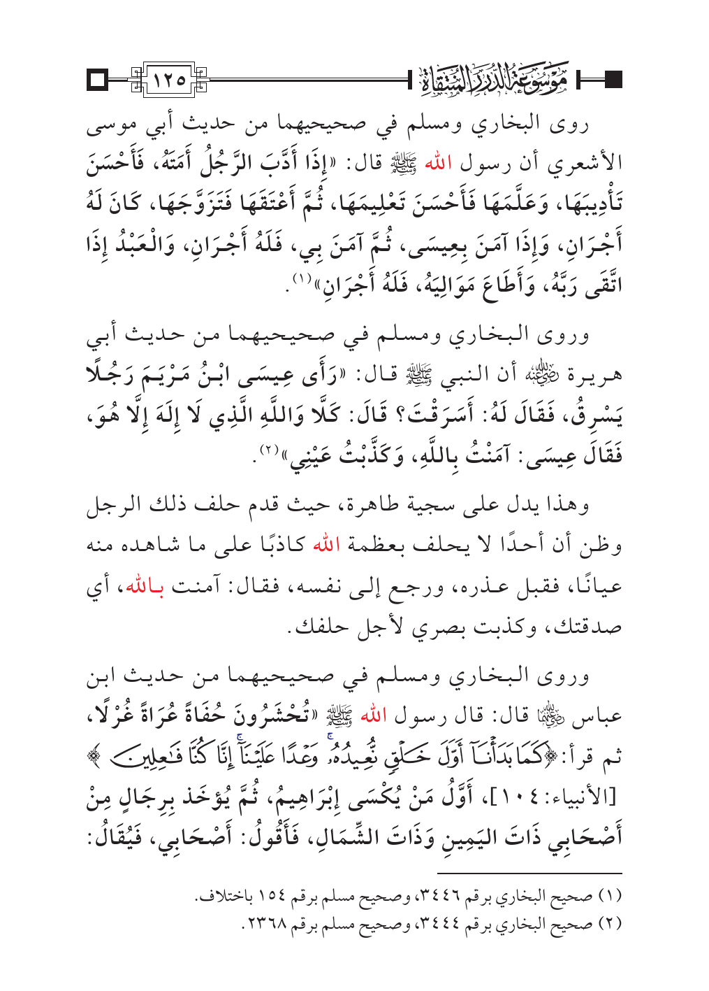 وروى البخاري ومسلم في صحيحيهما من حديث أبي هريرة - رضي الله عنه - أن النبي - صلى الله عليه وسلم - قال: «رَأَى عِيسَى ابْنُ مَرْيَمَ رَجُلًا يَسْرِقُ، فَقَالَ لَهُ: أَسَرَقْتَ؟ قَالَ: كَلَّا وَاللَّهِ الَّذِي لَا إِلَهَ إِلَّا هُوَ، فَقَالَ عِيسَى: آمَنْتُ بِاللَّهِ، وَكَذَّبْتُ عَيْنِي» (¬٢).