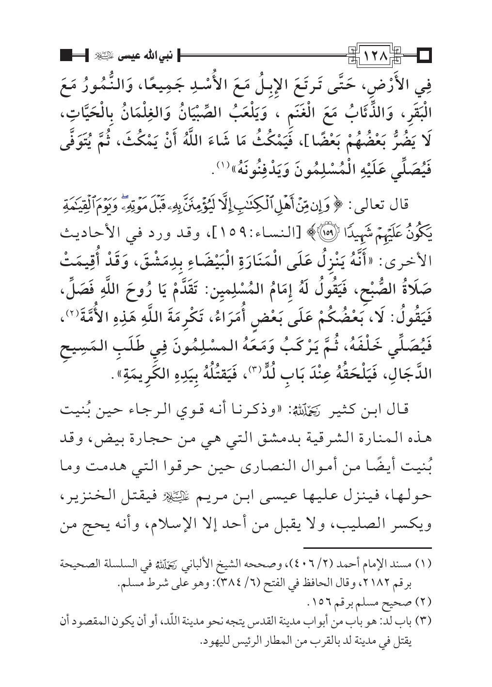 قال تعالى: {وَإِنْ مِنْ أَهْلِ الْكِتَابِ إِلَّا لَيُؤْمِنَنَّ بِهِ قَبْلَ مَوْتِهِ وَيَوْمَ الْقِيَامَةِ يَكُونُ عَلَيْهِمْ شَهِيدًا (١٥٩)} [النساء:١٥٩]، وقد ورد في الأحاديث الأخرى: «أَنَّهُ يَنْزِلُ عَلَى الْمَنَارَةِ الْبَيْضَاءِ بِدِمَشْقَ، وَقَدْ أُقِيمَتْ صَلَاةُ الصُّبْحِ، فَيَقُولُ لَهُ إِمَامُ المُسْلِميِن: تَقَدَّمْ يَا رُوحَ اللَّهِ فَصَلِّ، فَيَقُولُ: لَا، بَعْضُكُمْ عَلَى بَعْضٍ أُمَرَاءُ، تَكْرِمَةَ اللَّهِ هَذِهِ الأُمَّةَ (¬٢)، فَيُصَلِّي خَلْفَهُ، ثُمَّ يَرْكَبُ وَمَعَهُ المسْلِمُونَ فِيِ طَلَبِ المَسِيحِ الدَّجَالِ، فَيَلْحَقُهُ عِنْدَ بَابِ لُدٍّ (¬٣)، فَيَقتُلُهُ بِيَدِهِ الكَرِيمَةِ».