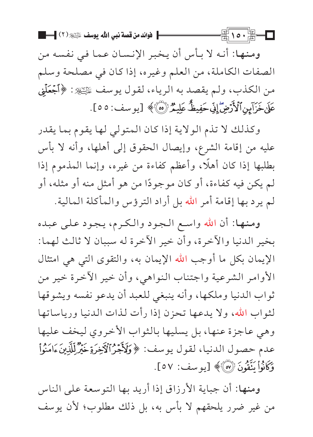 ومنها: أنه لا بأس أن يخبر الإنسان عما في نفسه من الصفات الكاملة، من العلم وغيره، إذا كان في مصلحة وسلم من الكذب، ولم يقصد به الرياء، لقول يوسف - عليه السلام -: {اجْعَلْنِي عَلَى خَزَائِنِ الْأَرْضِ إِنِّي حَفِيظٌ عَلِيمٌ (٥٥)} [يوسف:٥٥].