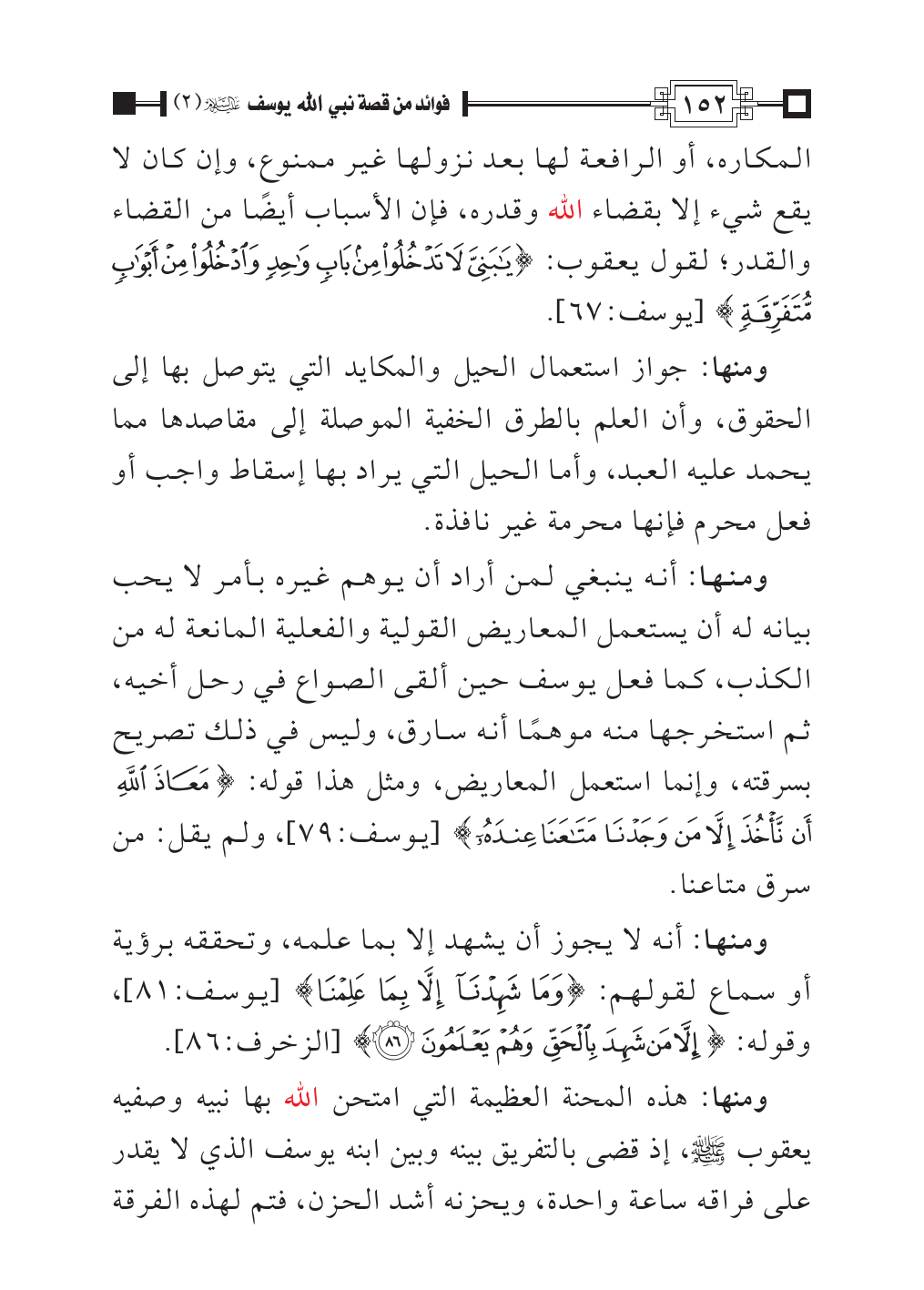 ومنها: أنه ينبغي لمن أراد أن يوهم غيره بأمر لا يحب بيانه له أن يستعمل المعاريض القولية والفعلية المانعة له من الكذب، كما فعل يوسف حين ألقى الصواع في رحل أخيه، ثم استخرجها منه موهمًا أنه سارق، وليس في ذلك تصريح بسرقته، وإنما استعمل المعاريض، ومثل هذا قوله: {مَعَاذَ اللَّهِ أَنْ نَأْخُذَ إِلَّا مَنْ وَجَدْنَا مَتَاعَنَا عِنْدَهُ} [يوسف:٧٩]، ولم يقل: من سرق متاعنا.