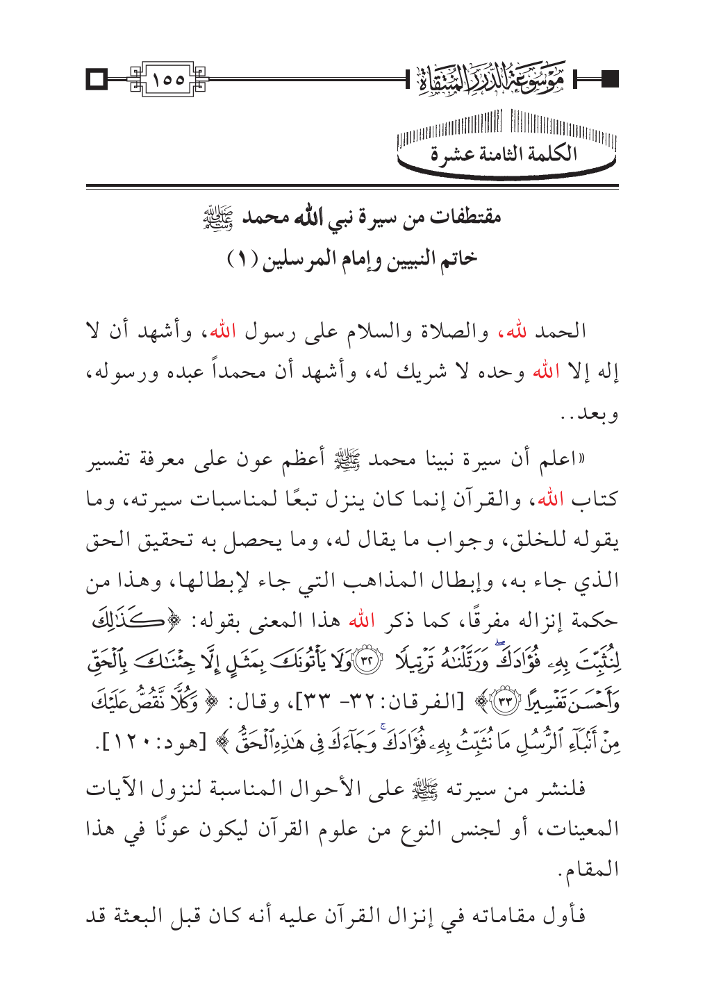 «اعلم أن سيرة نبينا محمد - صلى الله عليه وسلم - أعظم عون على معرفة تفسير كتاب الله، والقرآن إنما كان ينزل تبعًا لمناسبات سيرته، وما يقوله للخلق، وجواب ما يقال له، وما يحصل به تحقيق الحق الذي جاء به، وإبطال المذاهب التي جاء لإبطالها، وهذا من حكمة إنزاله مفرقًا، كما ذكر الله هذا المعنى بقوله: {كَذَلِكَ لِنُثَبِّتَ بِهِ فُؤَادَكَ وَرَتَّلْنَاهُ تَرْتِيلًا (٣٢) وَلَا يَأْتُونَكَ بِمَثَلٍ إِلَّا جِئْنَاكَ بِالْحَقِّ وَأَحْسَنَ تَفْسِيرًا (٣٣)} [الفرقان:٣٢ - ٣٣]، وقال: {وَكُلًّا نَقُصُّ عَلَيْكَ مِنْ أَنْبَاءِ الرُّسُلِ مَا نُثَبِّتُ بِهِ فُؤَادَكَ وَجَاءَكَ فِي هَذِهِ الْحَقُّ} [هود:١٢٠].