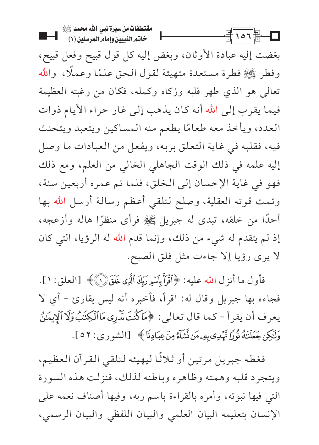 بغضت إليه عبادة الأوثان، وبغض إليه كل قول قبيح وفعل قبيح، وفطر - صلى الله عليه وسلم - فطرة مستعدة متهيئة لقول الحق علمًا وعملًا، والله تعالى هو الذي طهر قلبه وزكاه وكمله، فكان من رغبته العظيمة فيما يقرب إلى الله أنه كان يذهب إلى غار حراء الأيام ذوات العدد، ويأخذ معه طعامًا يطعم منه المساكين ويتعبد ويتحنث فيه، فقلبه في غاية التعلق بربه، ويفعل من العبادات ما وصل إليه علمه في ذلك الوقت الجاهلي الخالي من العلم، ومع ذلك فهو في غاية الإحسان إلى الخلق، فلما تم عمره أربعين سنة، وتمت قوته العقلية، وصلح لتلقي أعظم رسالة أرسل الله بها أحدًا من خلقه، تبدى له جبريل - صلى الله عليه وسلم - فرأى منظرًا هاله وأزعجه، إذ لم يتقدم له شيء من ذلك، وإنما قدم الله له الرؤيا، التي كان لا يرى رؤيا إلا جاءت مثل فلق الصبح.