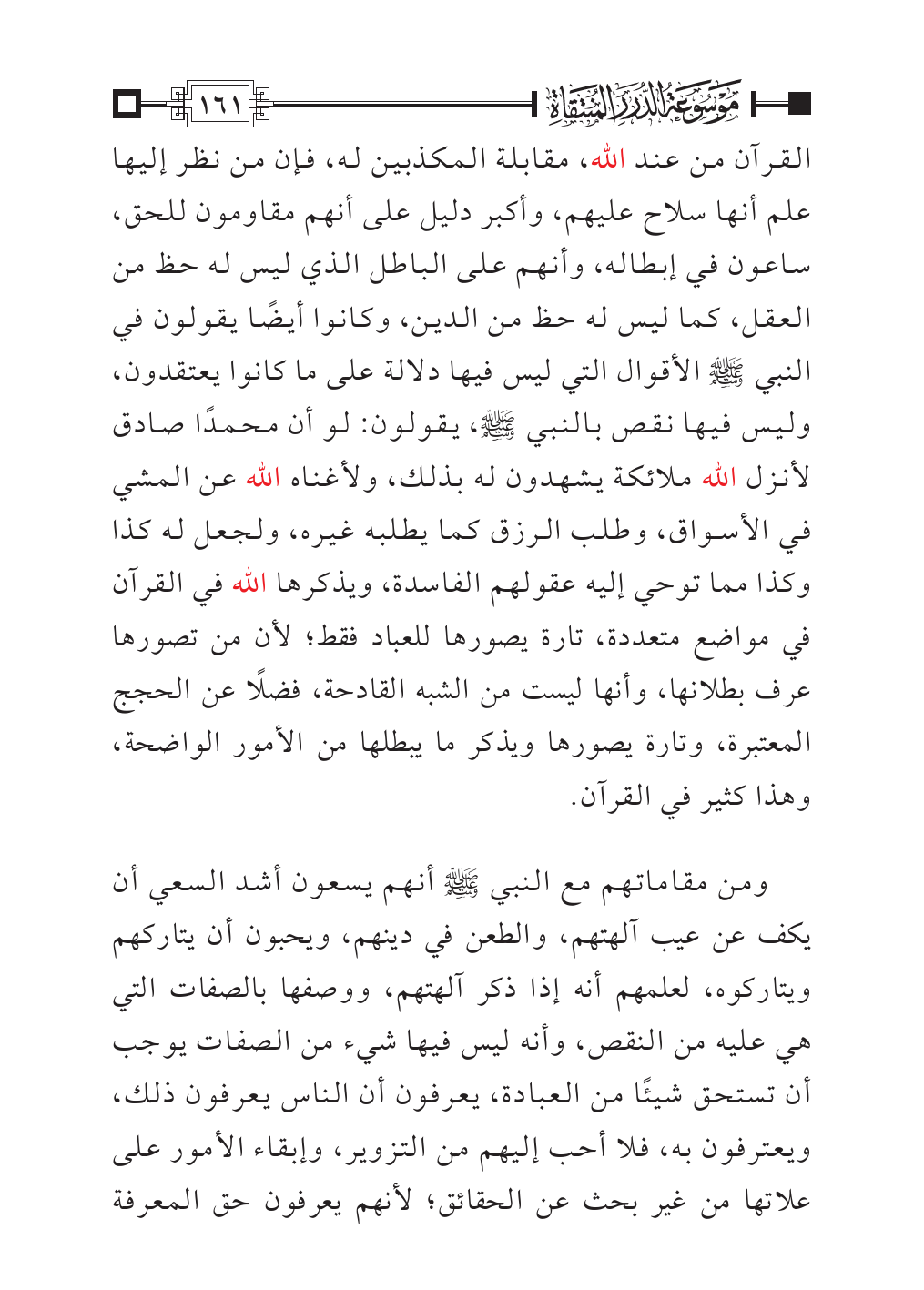 القرآن من عند الله، مقابلة المكذبين له، فإن من نظر إليها علم أنها سلاح عليهم، وأكبر دليل على أنهم مقاومون للحق، ساعون في إبطاله، وأنهم على الباطل الذي ليس له حظ من العقل، كما ليس له حظ من الدين، وكانوا أيضًا يقولون في النبي - صلى الله عليه وسلم - الأقوال التي ليس فيها دلالة على ما كانوا يعتقدون، وليس فيها نقص بالنبي - صلى الله عليه وسلم -، يقولون: لو أن محمدًا صادق لأنزل الله ملائكة يشهدون له بذلك، ولأغناه الله عن المشي في الأسواق، وطلب الرزق كما يطلبه غيره، ولجعل له كذا وكذا مما توحي إليه عقولهم الفاسدة، ويذكرها الله في القرآن في مواضع متعددة، تارة يصورها للعباد فقط؛ لأن من تصورها عرف بطلانها، وأنها ليست من الشبه القادحة، فضلًا عن الحجج المعتبرة، وتارة يصورها ويذكر ما يبطلها من الأمور الواضحة، وهذا كثير في القرآن.