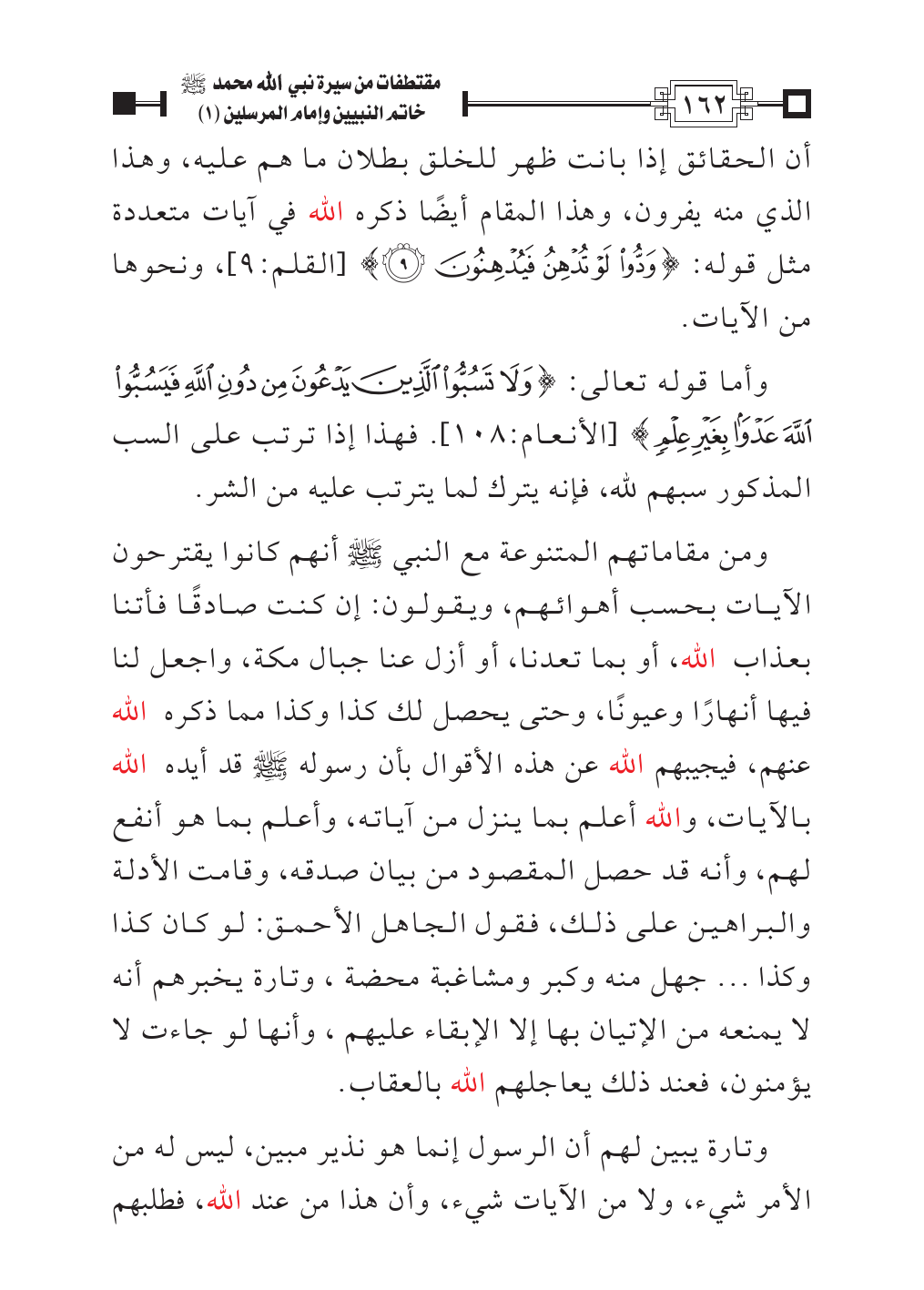 ومن مقاماتهم المتنوعة مع النبي - صلى الله عليه وسلم - أنهم كانوا يقترحون الآيات بحسب أهوائهم، ويقولون: إن كنت صادقًا فأتنا بعذاب الله، أو بما تعدنا، أو أزل عنا جبال مكة، واجعل لنا فيها أنهارًا وعيونًا، وحتى يحصل لك كذا وكذا مما ذكره الله عنهم، فيجيبهم الله عن هذه الأقوال بأن رسوله - صلى الله عليه وسلم - قد أيده الله بالآيات، والله أعلم بما ينزل من آياته، وأعلم بما هو أنفع لهم، وأنه قد حصل المقصود من بيان صدقه، وقامت الأدلة والبراهين على ذلك، فقول الجاهل الأحمق: لو كان كذا وكذا ... جهل منه وكبر ومشاغبة محضة، وتارة يخبرهم أنه لا يمنعه من الإتيان بها إلا الإبقاء عليهم، وأنها لو جاءت لا يؤمنون، فعند ذلك يعاجلهم الله بالعقاب.